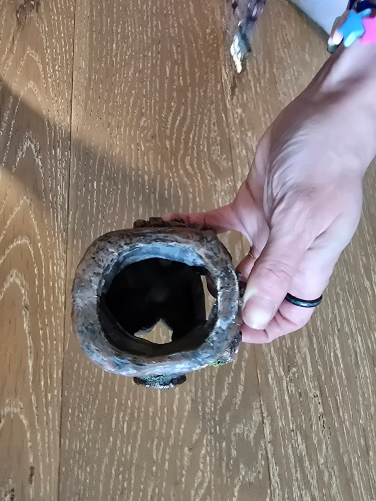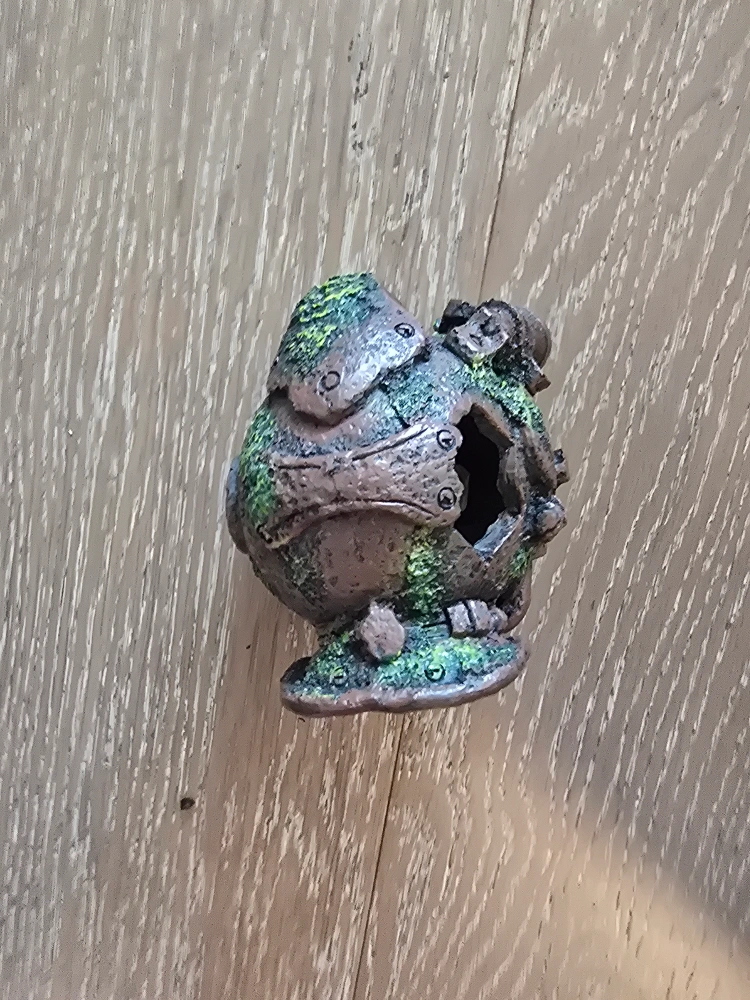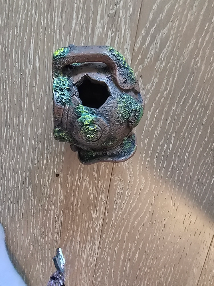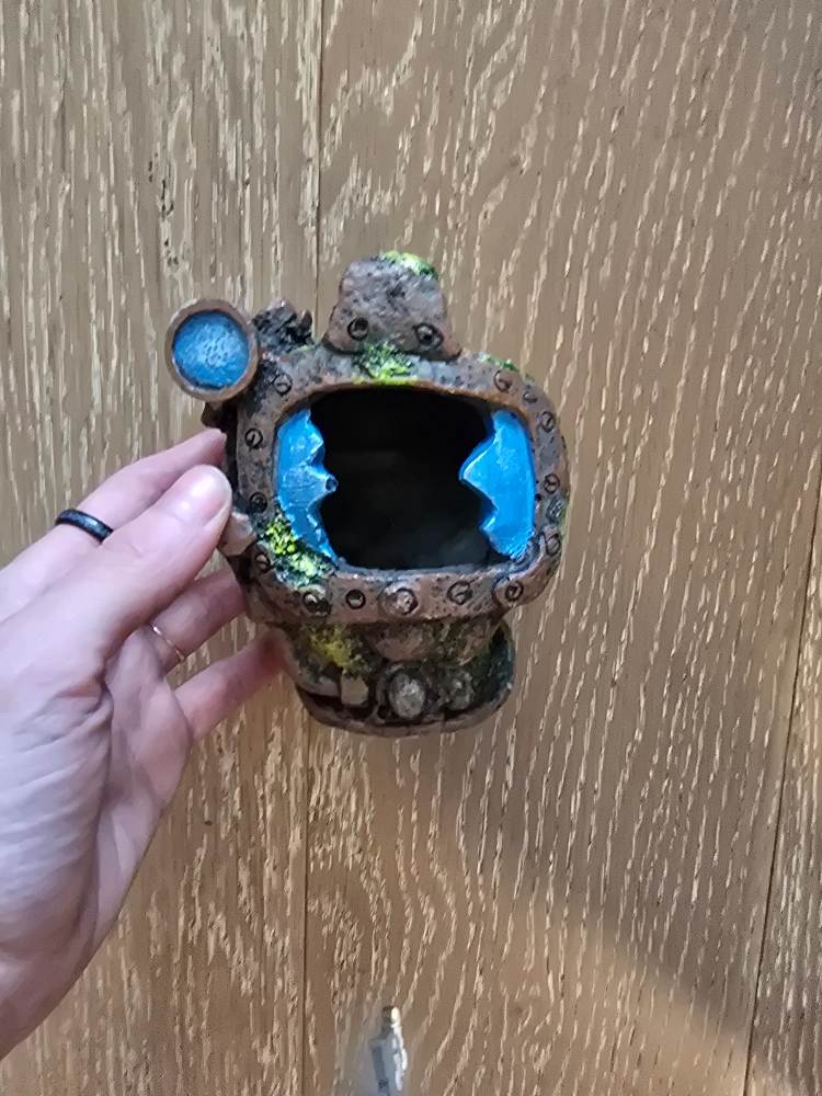 Ornament in a submarine shape. Mostly grey and brown with green algae-like details. A hole on the front. Place this ornament inside your aquarium to help your fish feel right at home.