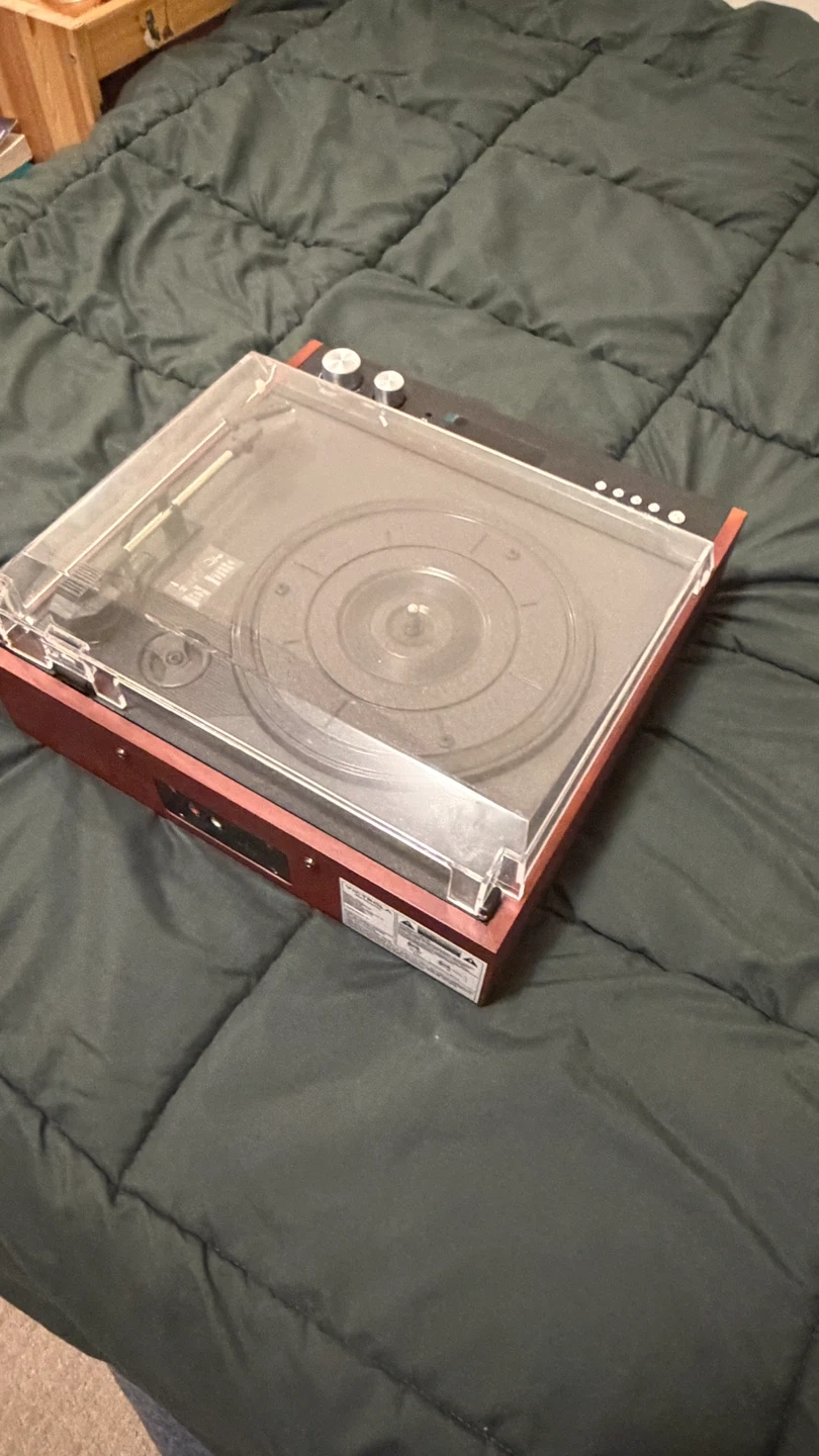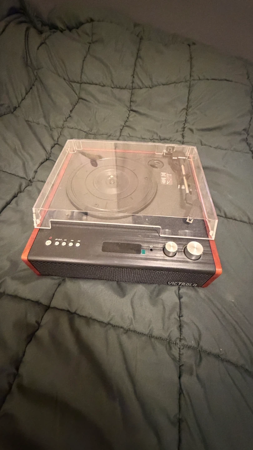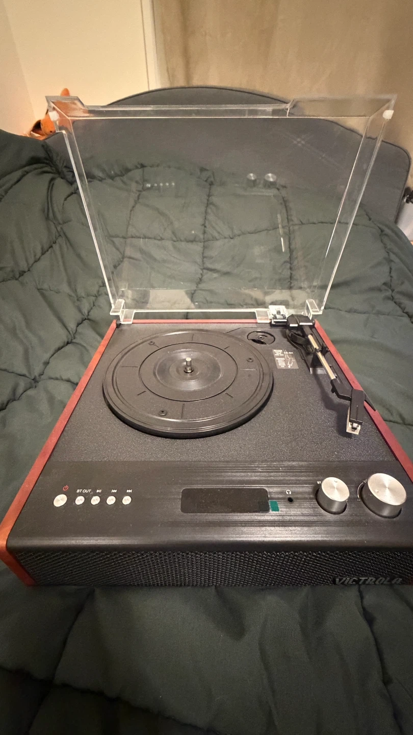 Victrola record player with built-in speakers. It has multiple playback options and a dust cover. Perfect for playing your vinyl collection!