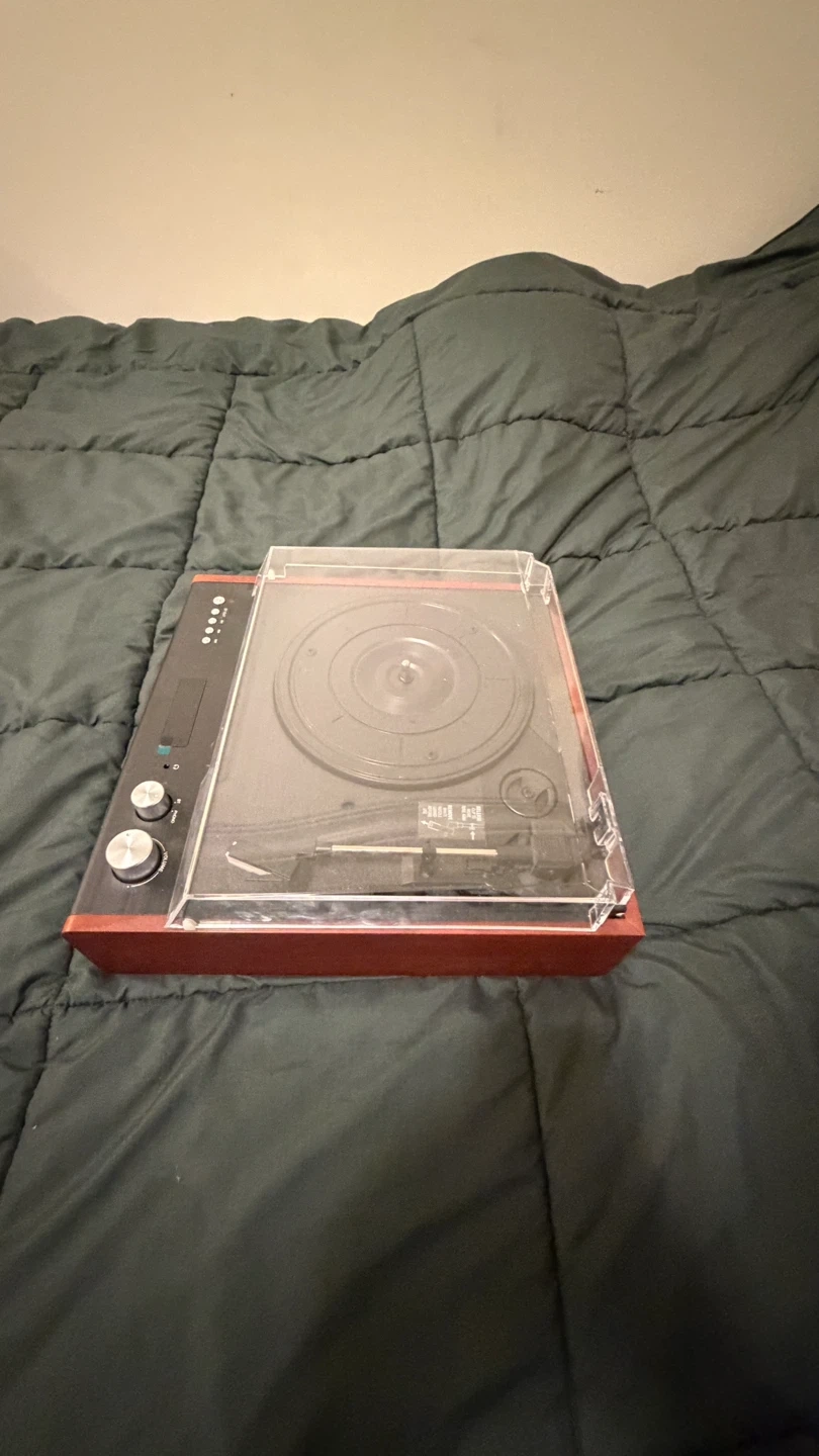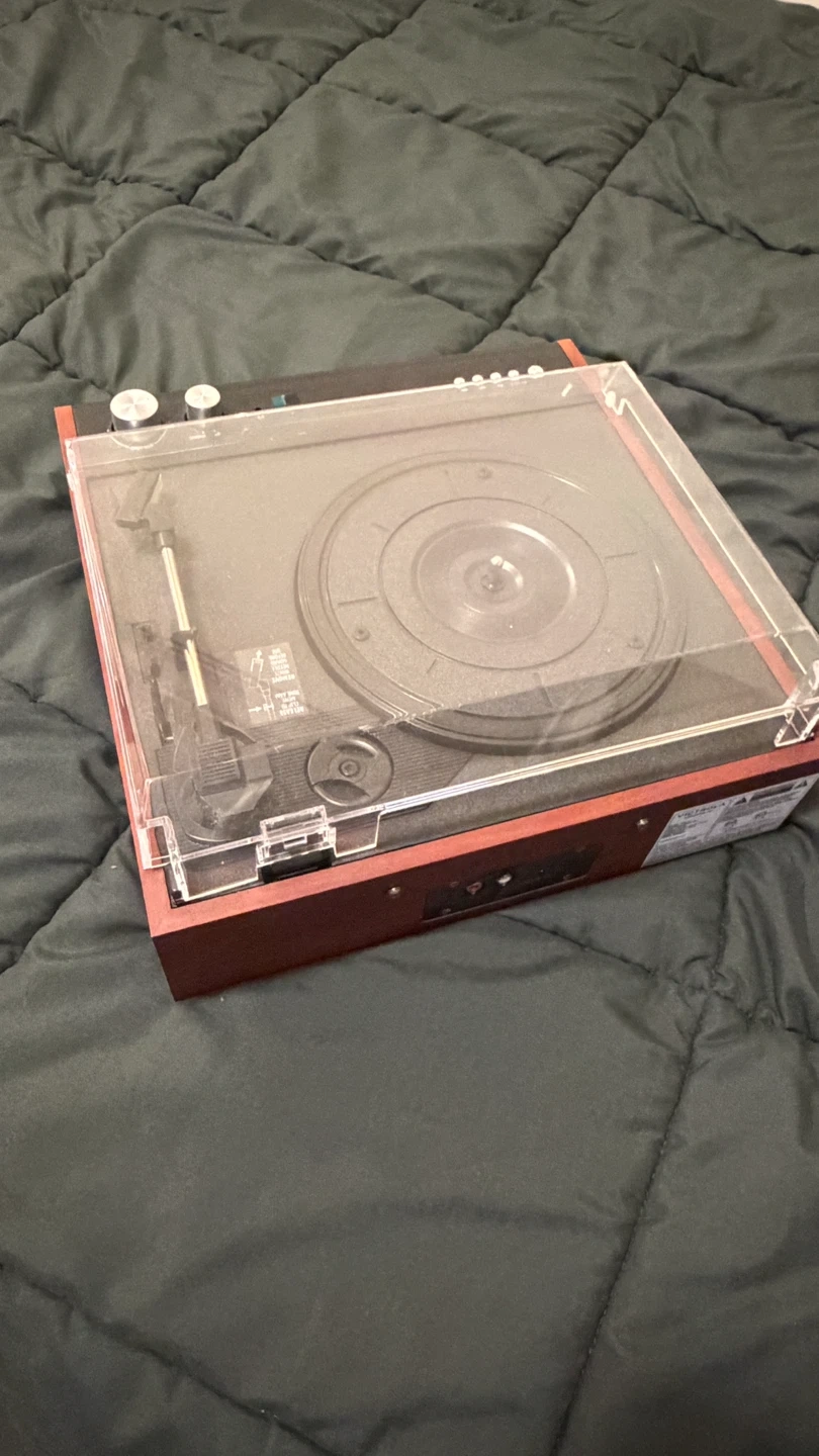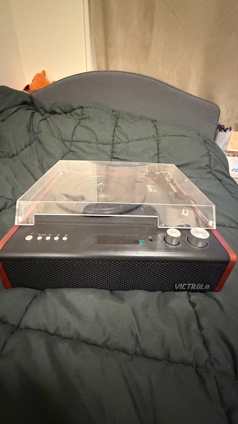 Victrola record player with built-in speakers. It has multiple playback options and a dust cover. Perfect for playing your vinyl collection!