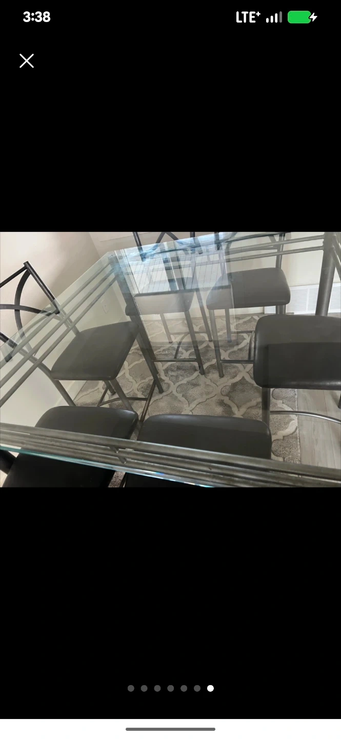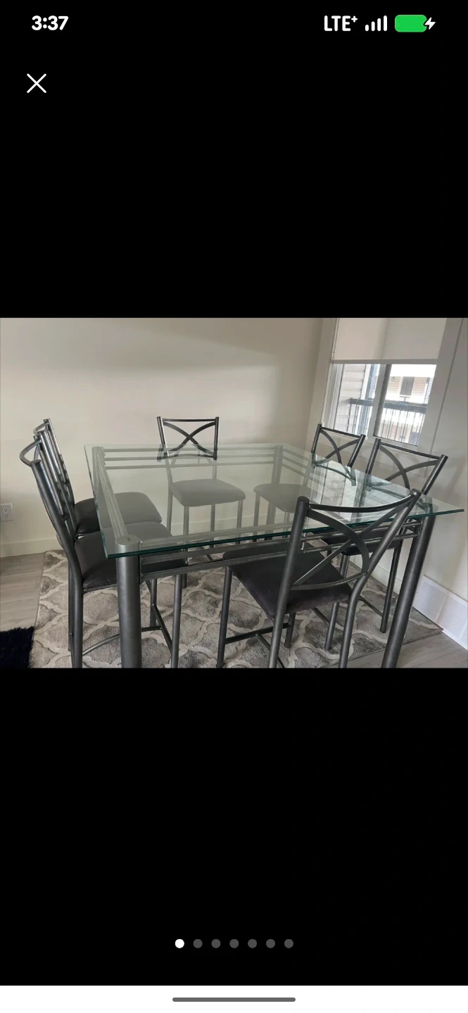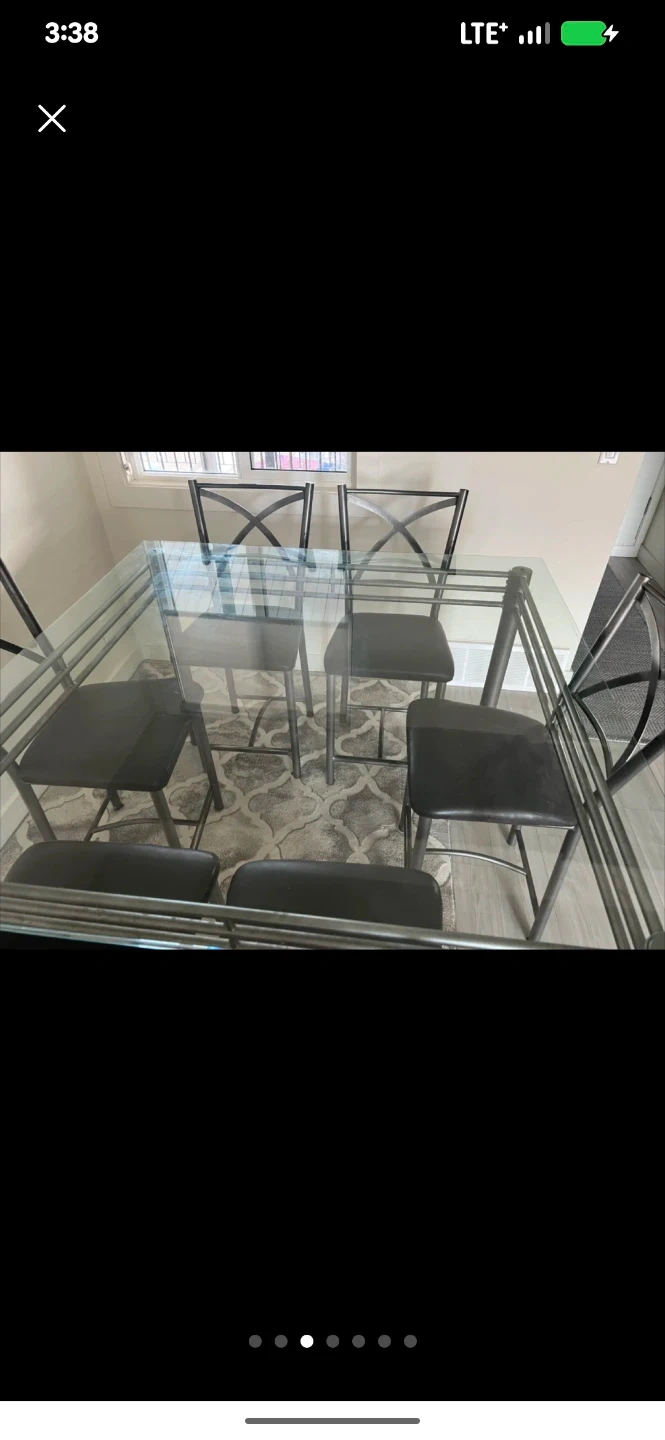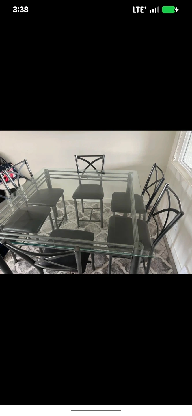 This dining set includes a glass-top table with a metal frame and six matching chairs. The chairs have upholstered seats for comfort. It's perfect for family meals or entertaining guests. Solid glass table and chairs perfect condations