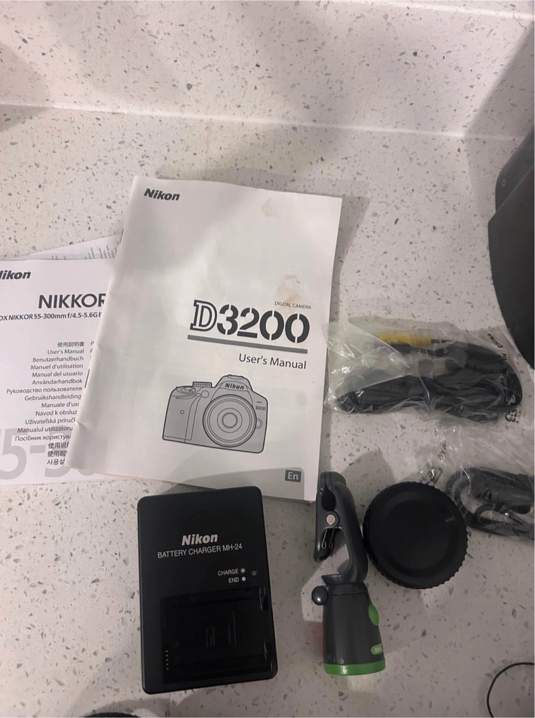 Selling a Nikon D3200 digital camera. It comes with a battery charger and user's manual. Also included are two lenses: a Nikon DX AF-S Nikkor 18-55mm 1:3.5-5.6G and a Nikon DX AF-S Nikkor 55-300mm 1:4.5-5.6G ED lens. Great for getting started with photography!