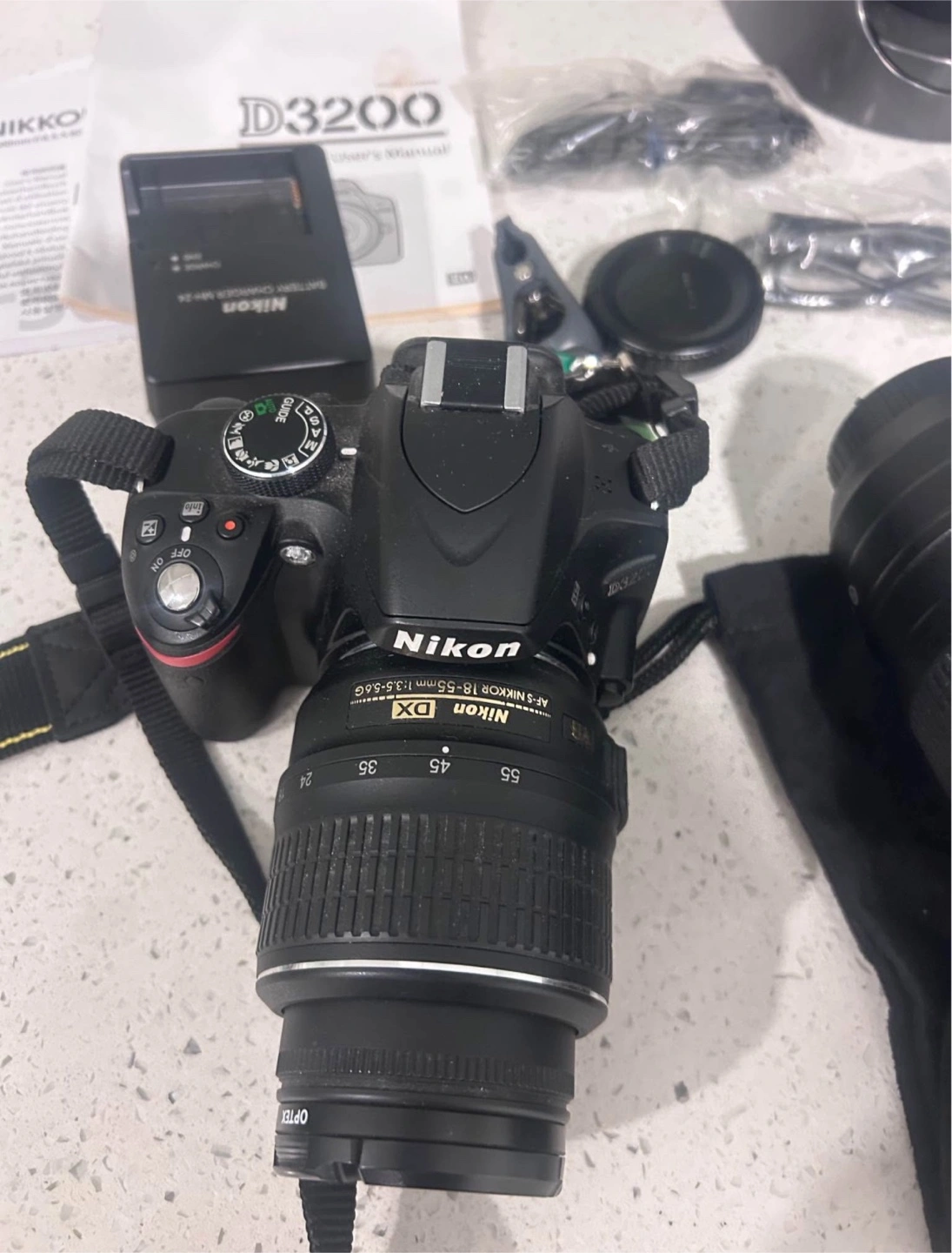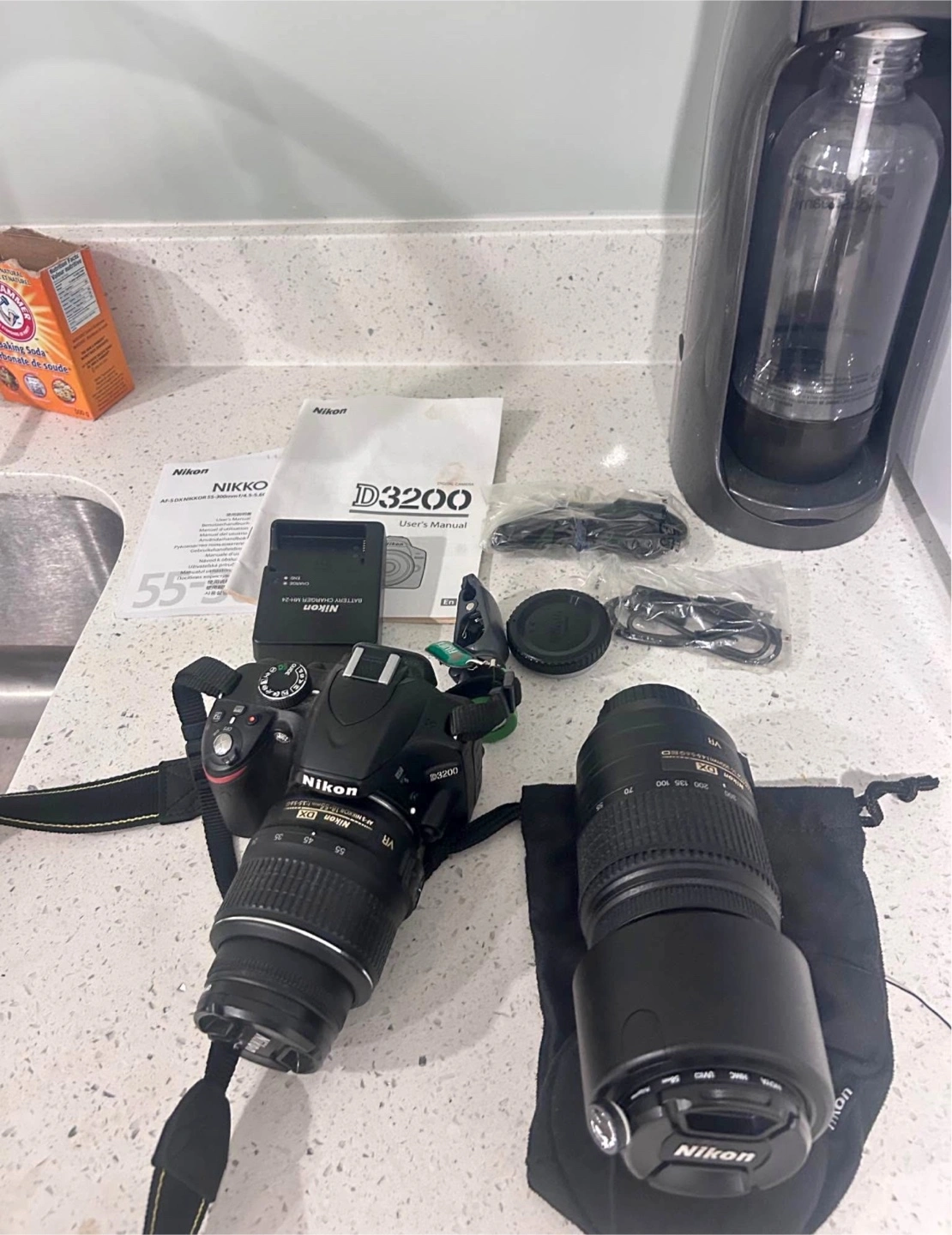 Selling a Nikon D3200 digital camera. It comes with a battery charger and user's manual. Also included are two lenses: a Nikon DX AF-S Nikkor 18-55mm 1:3.5-5.6G and a Nikon DX AF-S Nikkor 55-300mm 1:4.5-5.6G ED lens. Great for getting started with photography!