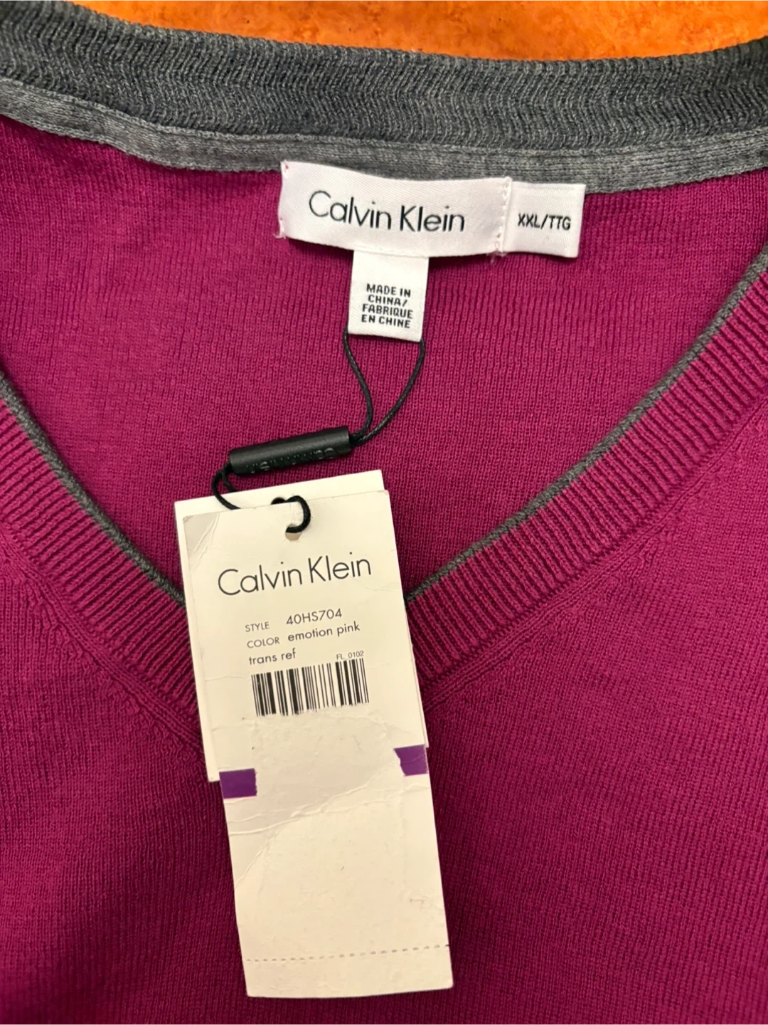 This is a new Calvin Klein men's V-neck sweater in a vibrant emotion pink color. It's a size XXL/TTG and made in Vietnam. The sweater features a classic V-neckline and a comfortable fit.