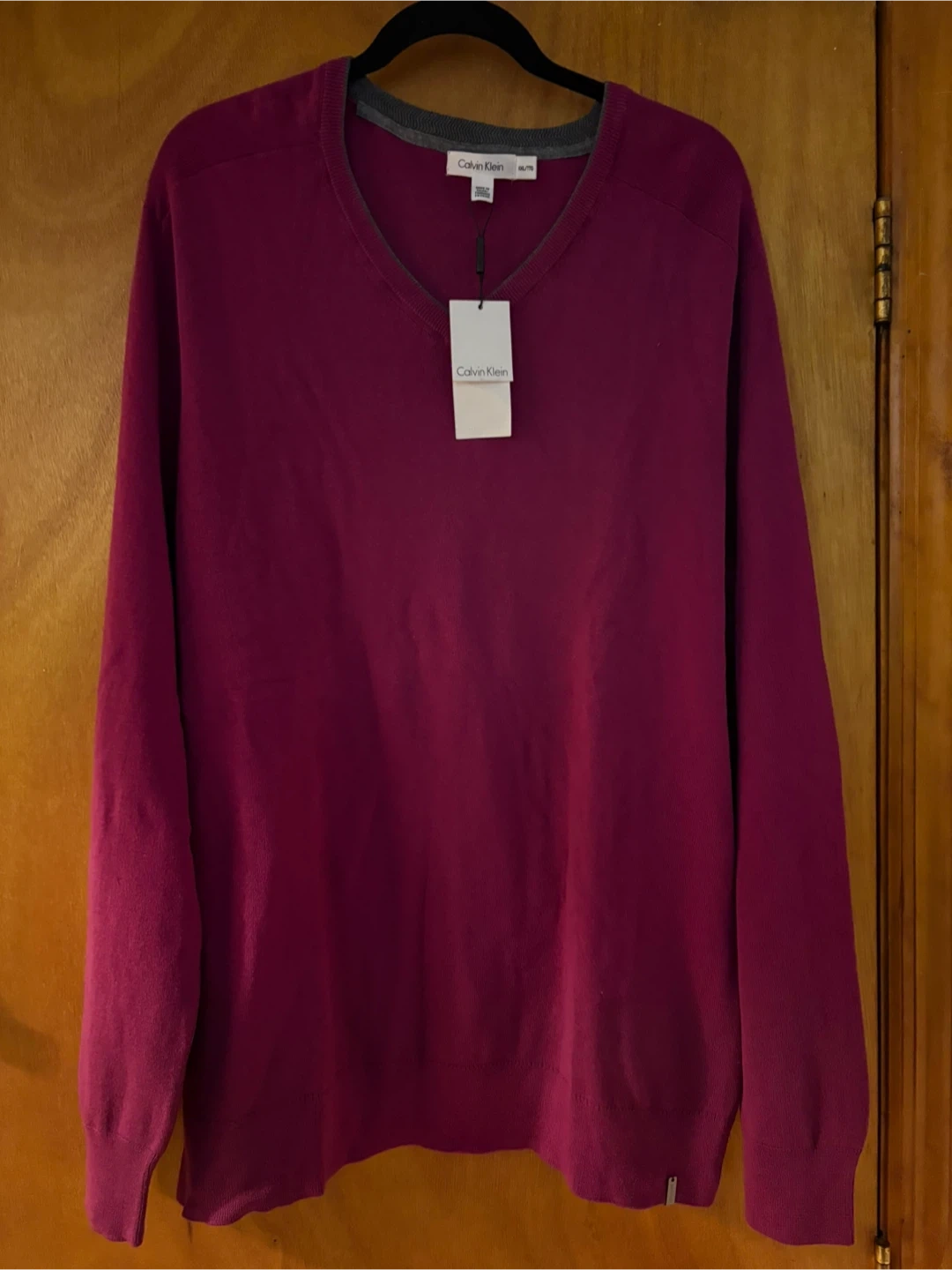 This is a new Calvin Klein men's V-neck sweater in a vibrant emotion pink color. It's a size XXL/TTG and made in Vietnam. The sweater features a classic V-neckline and a comfortable fit.