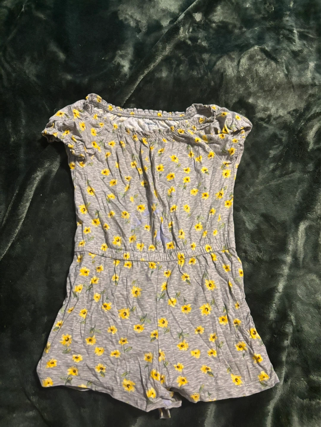 This Old Navy girls' romper features a cheerful grey and yellow sunflower print. It's a size 6-7 with a comfortable, elasticized neckline and waist. Great for playtime or casual outings!