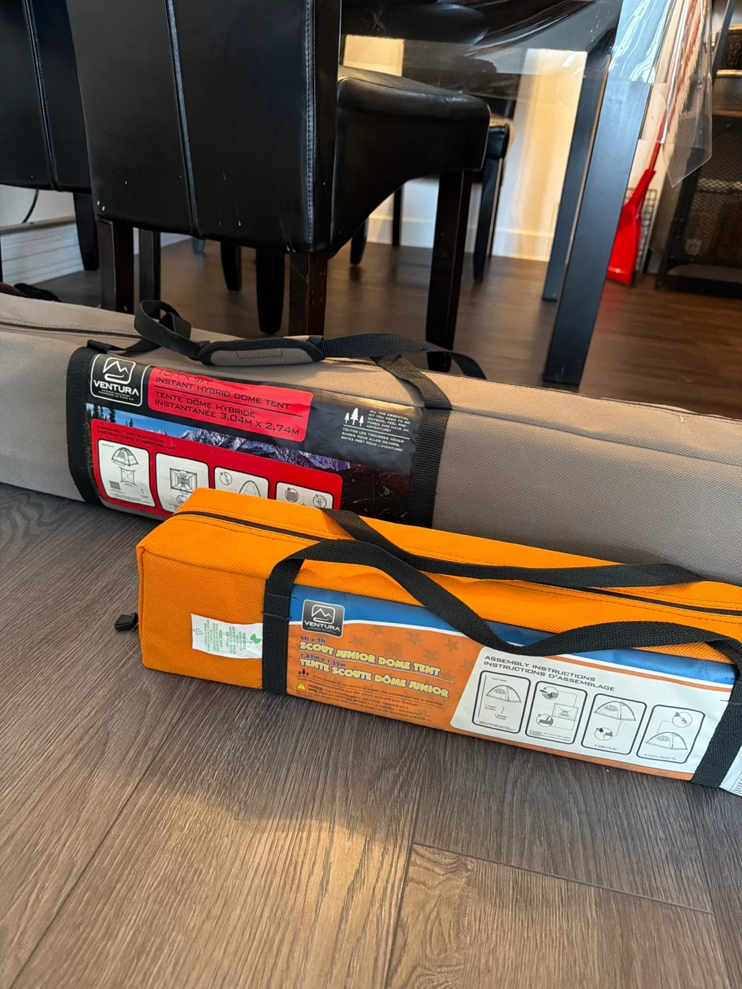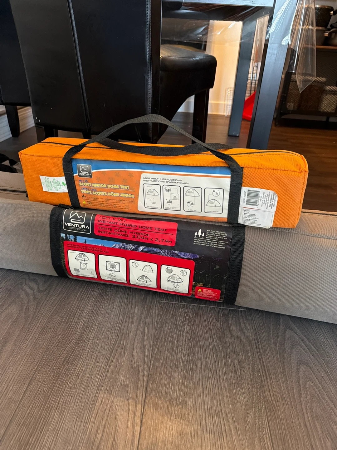 Ventura Instant Hybrid Dome Tent with dimensions 3.04m x 2.74m. It's a two-person tent. Also includes a Ventura Scout Junior Dome Tent. Both are bundled in their carrying bags.