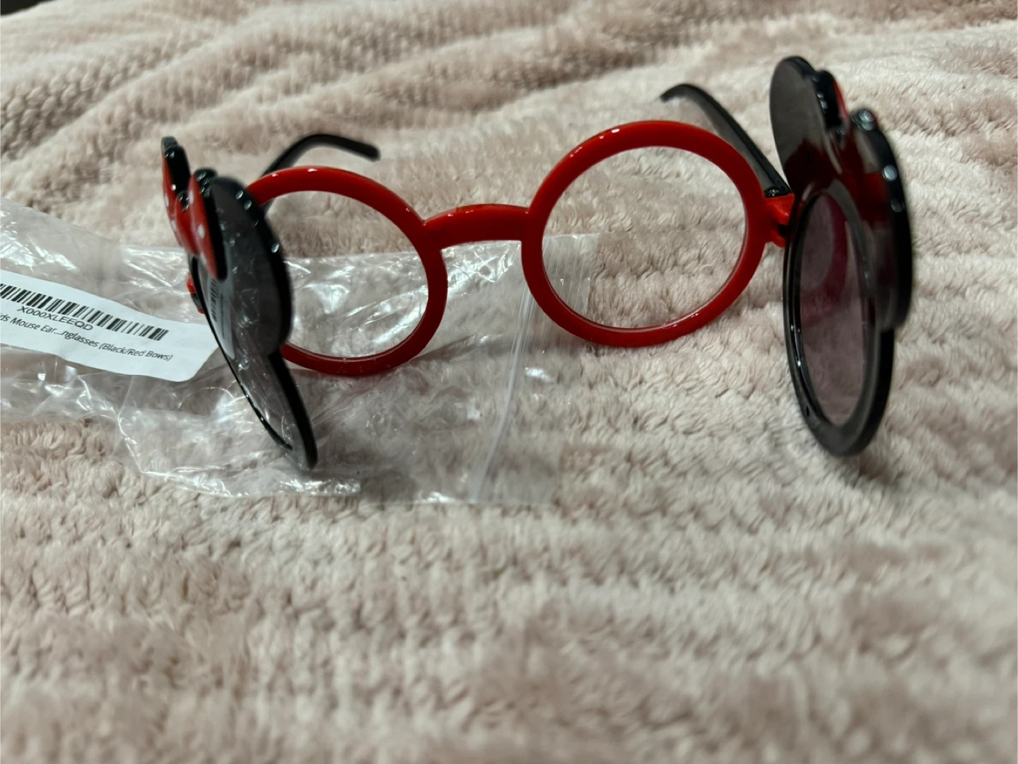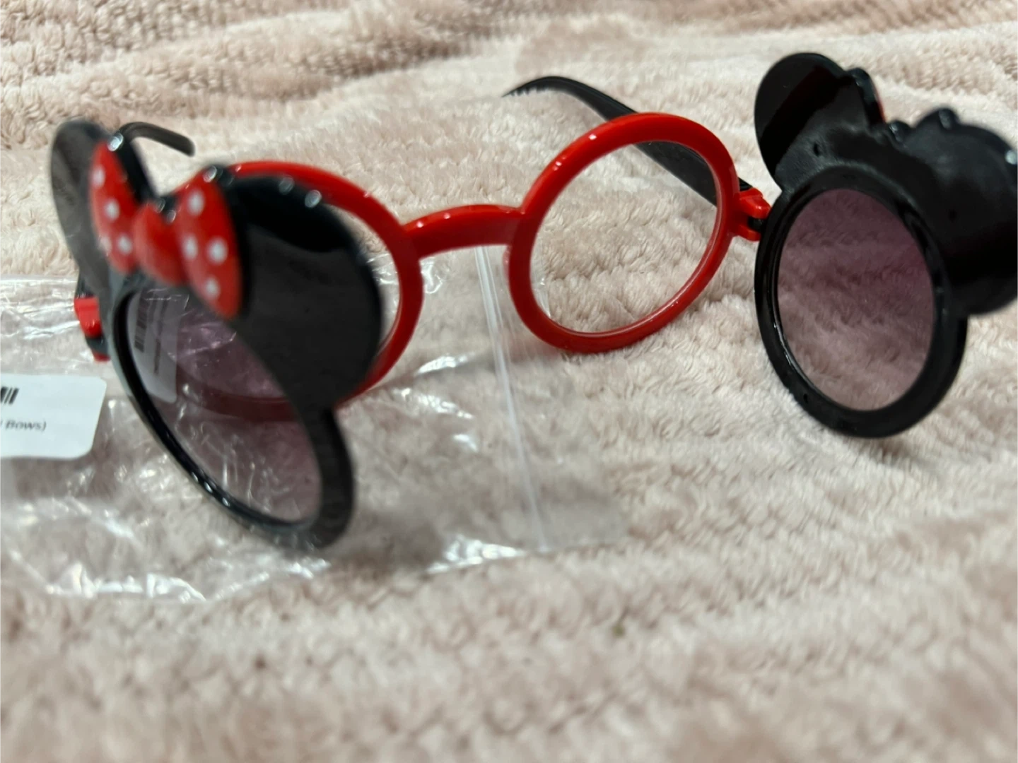 These adorable kids' Minnie Mouse sunglasses are brand new and still in their original packaging! They feature a cute black frame with red bows. Perfect for keeping your little one stylish and protected from the sun