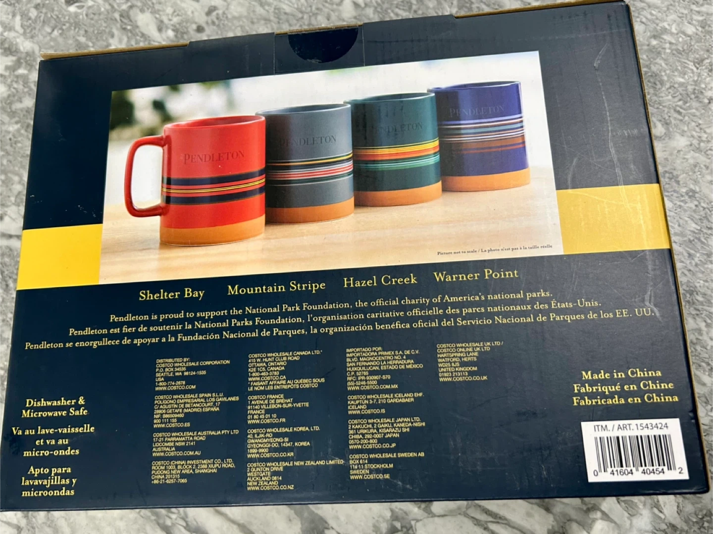 Includes 4 large mugs (533 mL / 18 oz) with the classic Pendleton stripe designs. Super nice quality and perfect for coffee, tea, or hot chocolate β