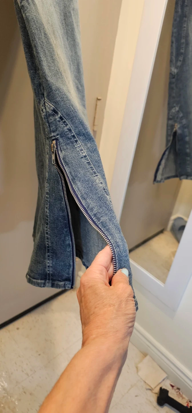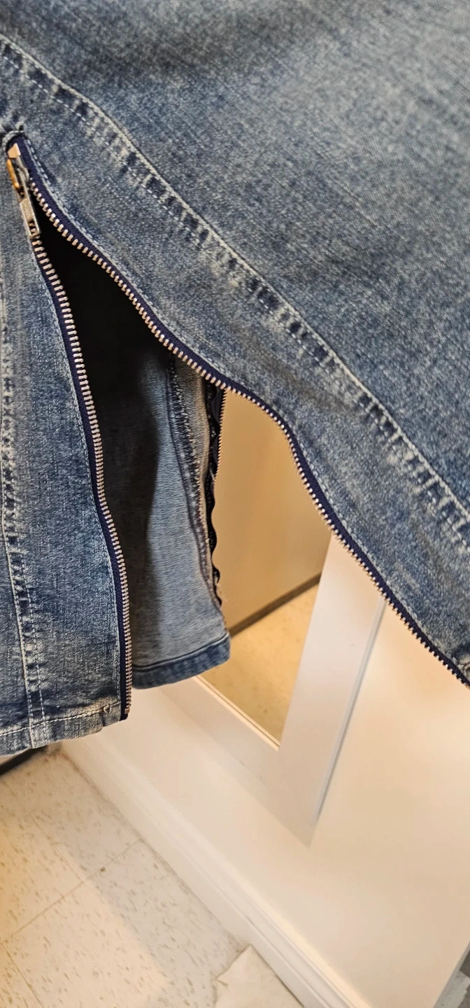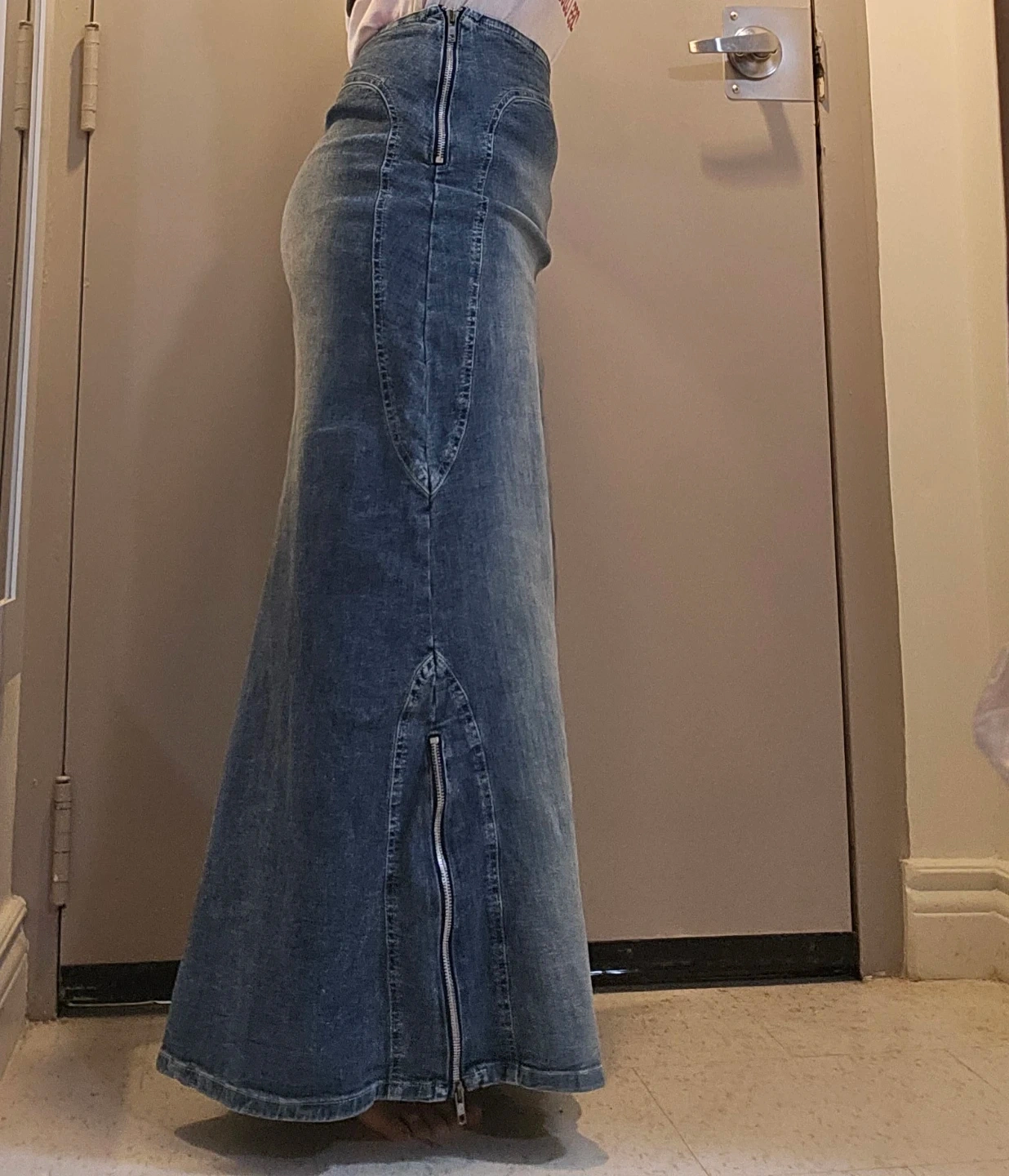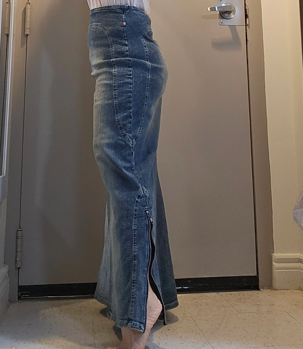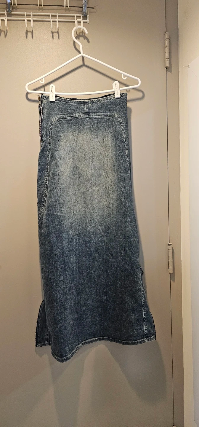 Maxi denim skirt from thee.co. It's a stretchy jean material. Features a full-length zipper closure and a flared hem with a zipper detail. Cotton and spandex blend. Made in Canada.