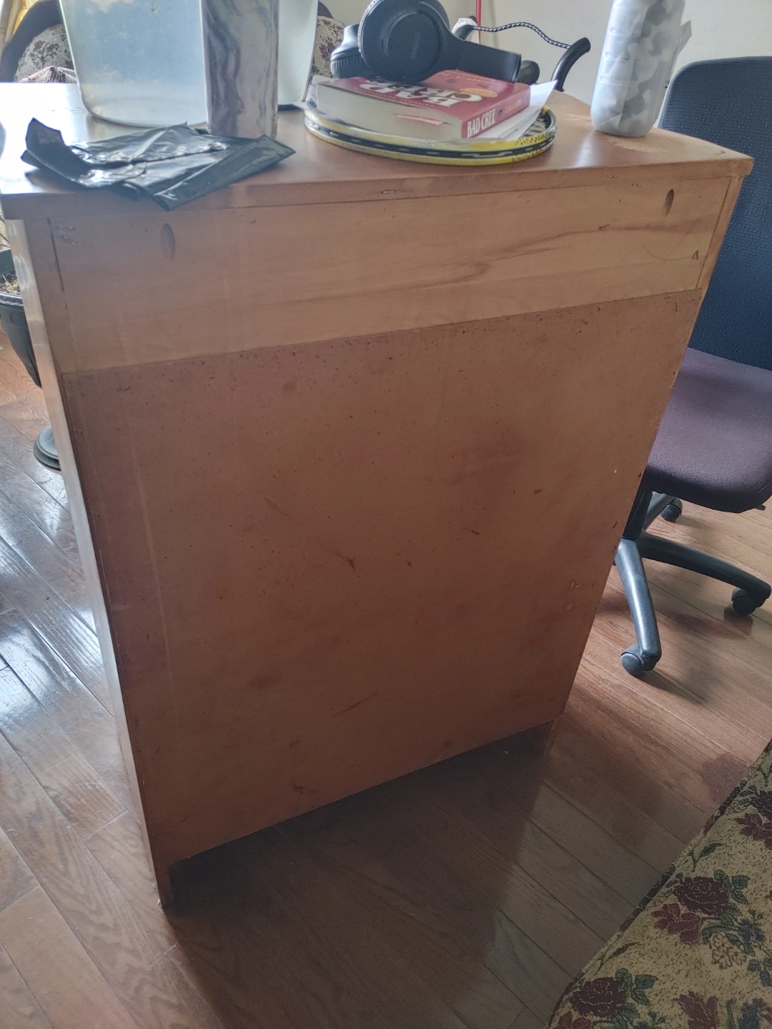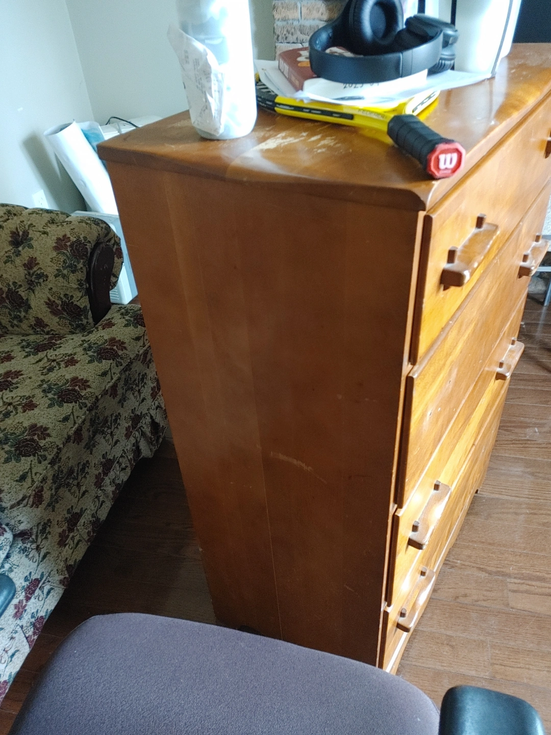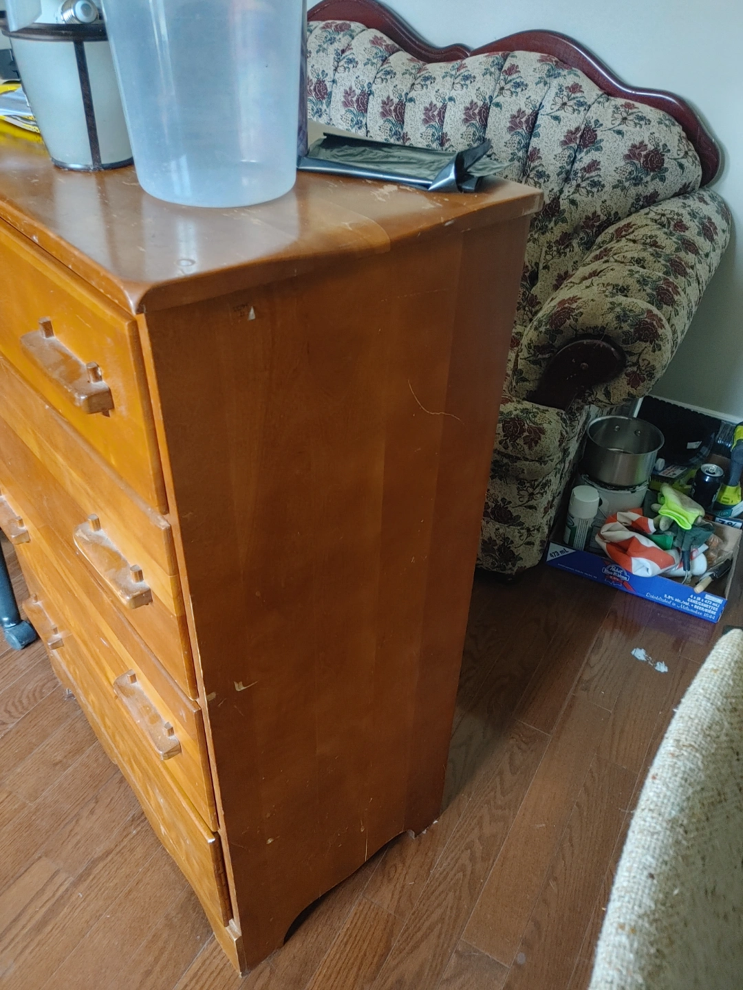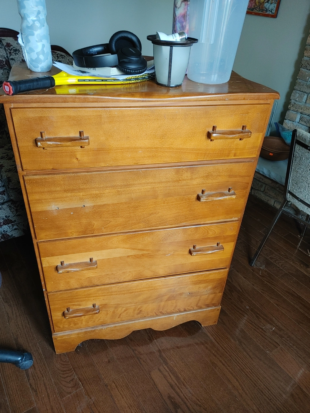 Four-drawer dresser. Solid wood construction. Shows some wear and tear. Excellent for storage. Could use a bit of cleaning.