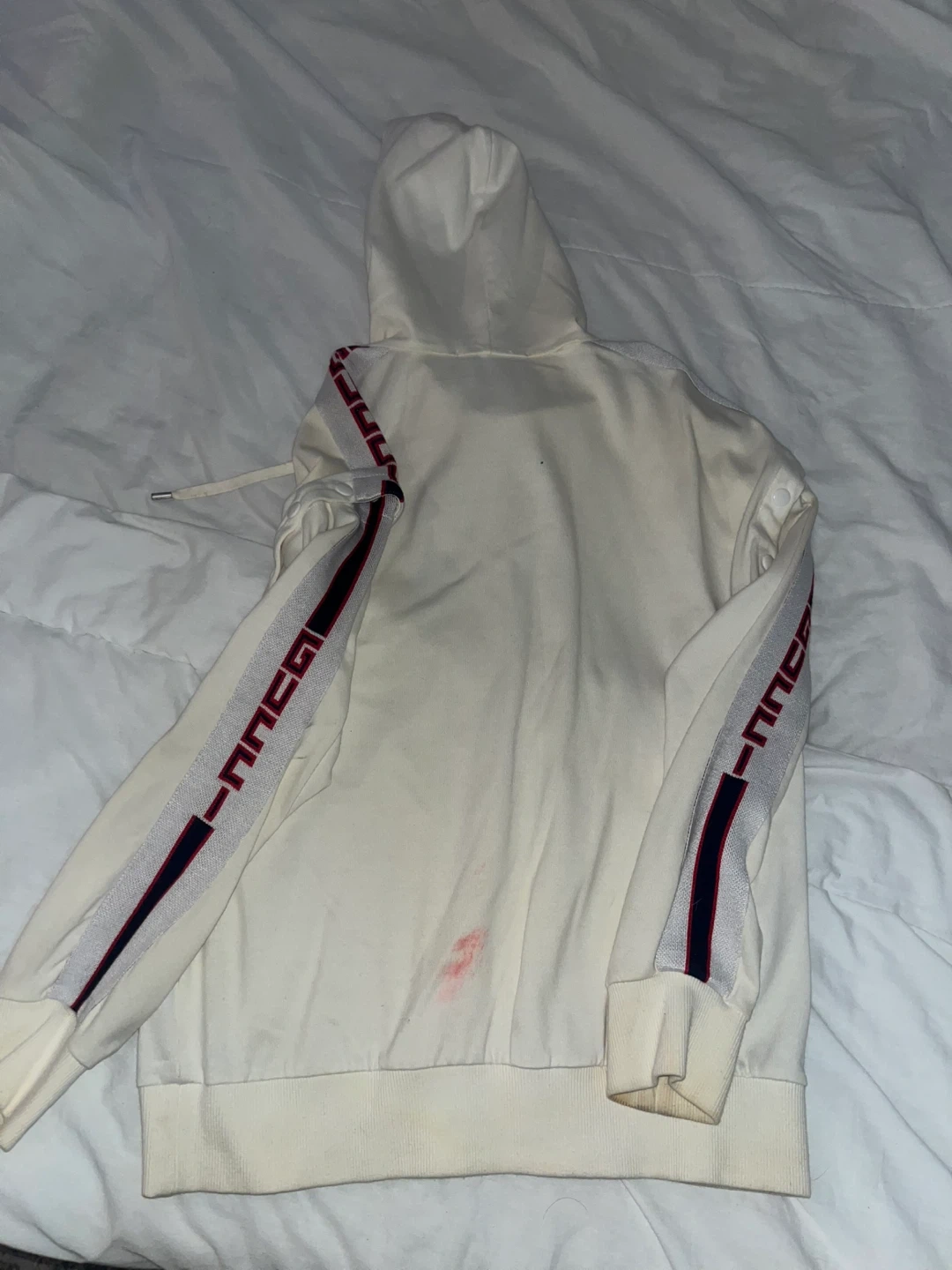Cream Gucci hoodie with logo tape on the sleeves. It has some minor staining on the front and inside the hood, as shown in photos. Made from a comfortable cotton blend.