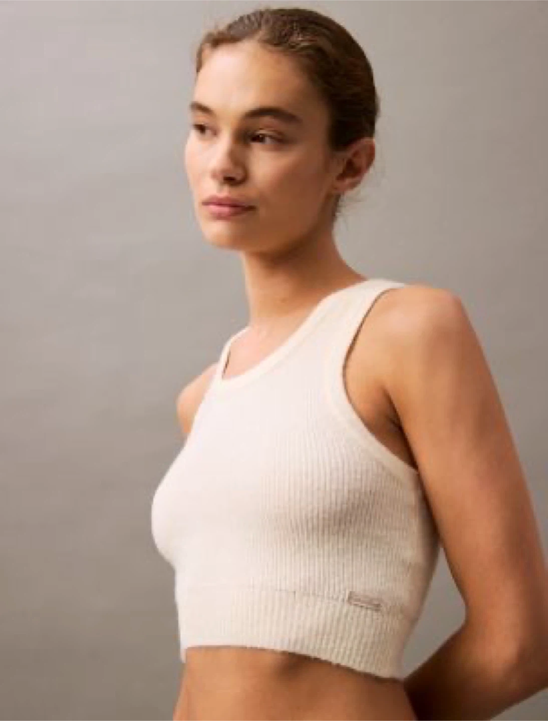 Cream coloured Calvin Klein ribbed cropped tank top. Made from a soft knit material. It's a stylish layering piece for any season!