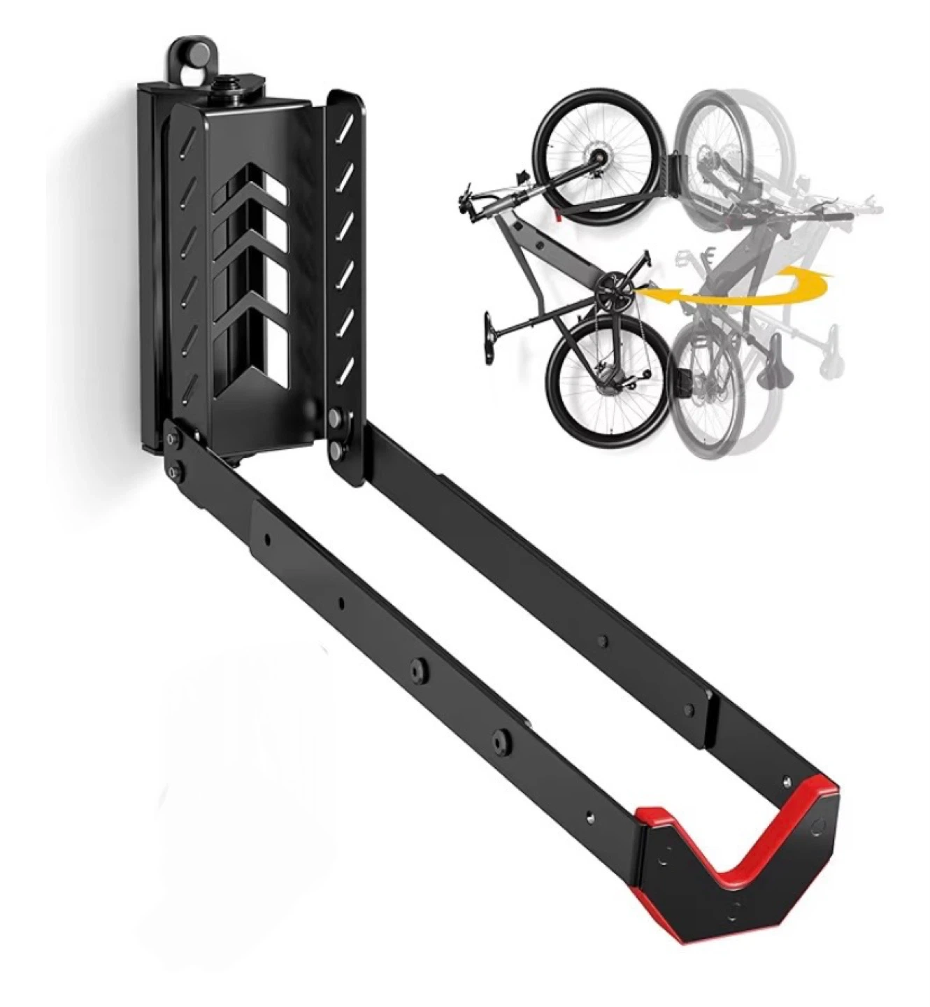 This is a black wall-mounted bike rack. It's made of sturdy metal and has protective red accents on the hook. The rack swivels to save space in your garage. Keeps your bicycle secure and off the floor!