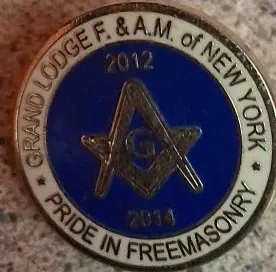 This is a Masonic token from the Grand Lodge F. & A. M. of New York. It features the year 2012 on top and 2014 on the bottom. The token also states 'Pride in Freemasonry'.