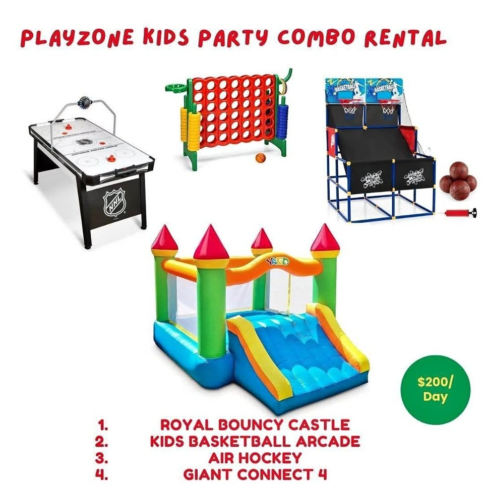 Turn any celebration into an action-packed play zone with our Playzone Kids Party Combo rental in Edmonton. The Playzone Kids Party Combo includes the Royal Bounce House, Air Hockey Table, Kids Basketball Arcade Game, and Giant Connect 4 Yard Game. Designed for indoor and outdoor use, this package works well in backyards, basements, community halls, gyms, and event venues. Available for rent in Edmonton.