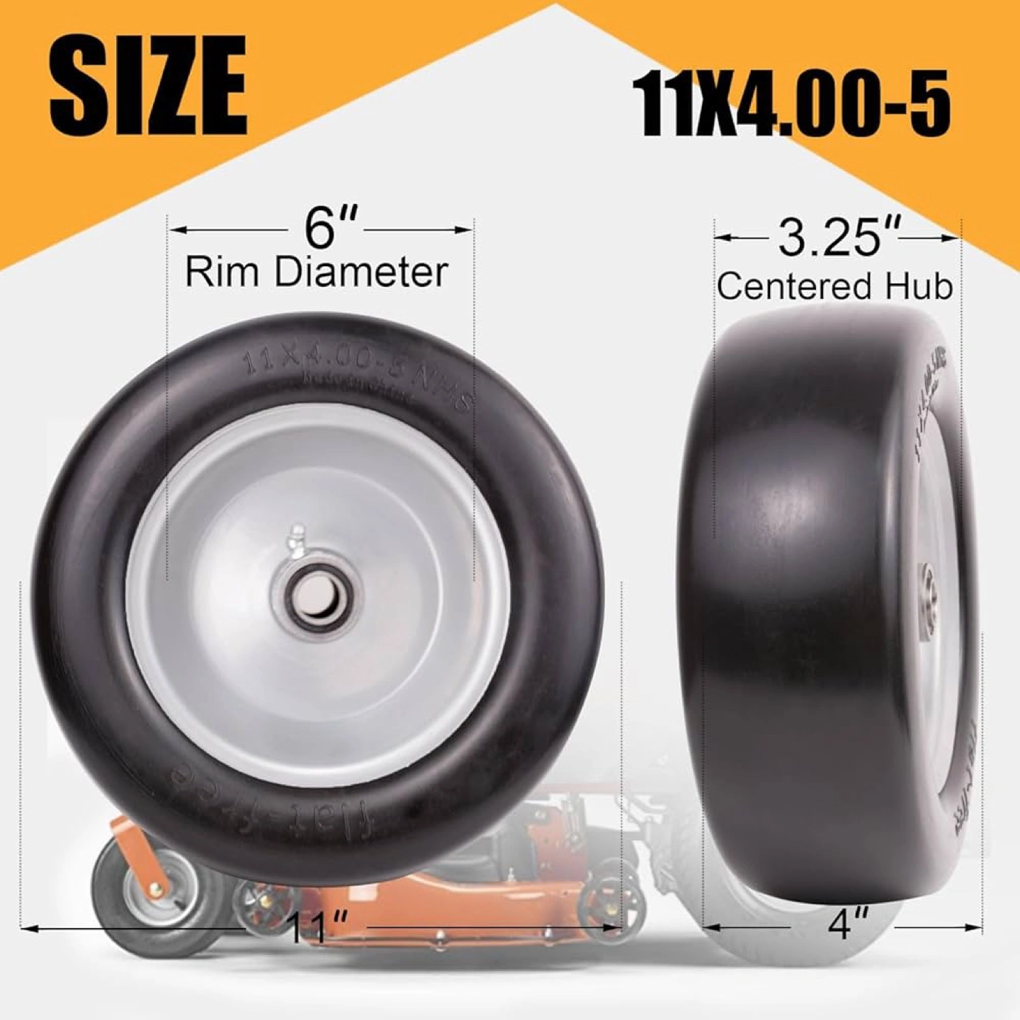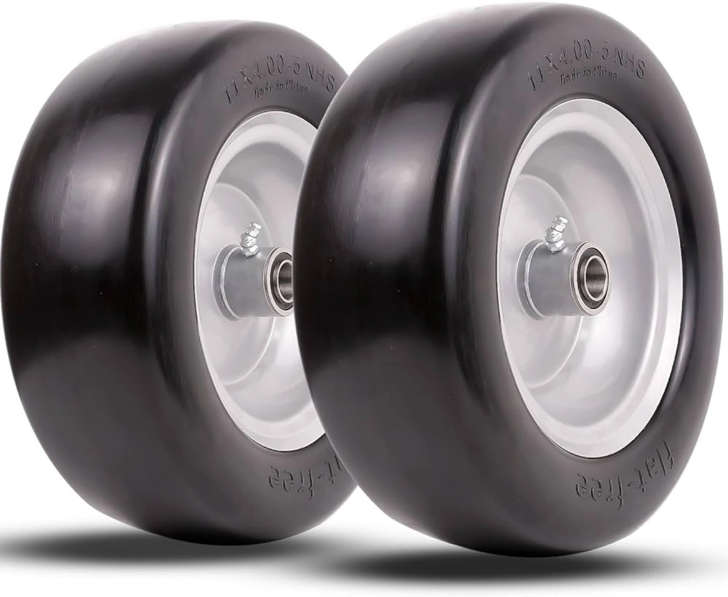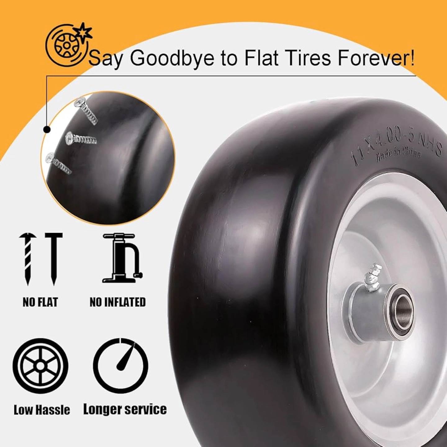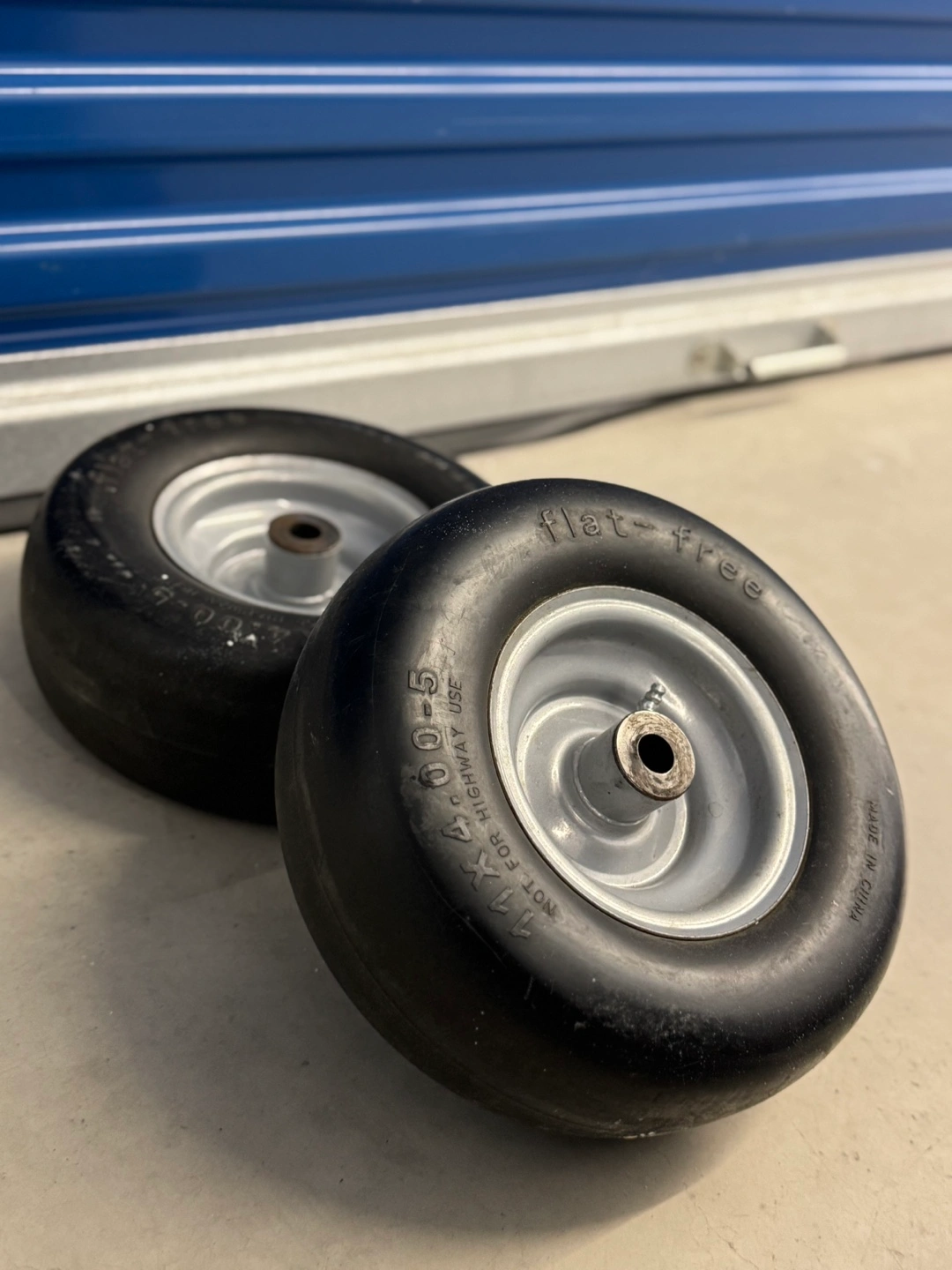 Selling a set of 11x4.00-5 solid flat-free tires with wheels, ideal for zero-turn lawn mowers or other outdoor equipment. Durable and reliable, these tires are designed for smooth performance without the need for inflation.