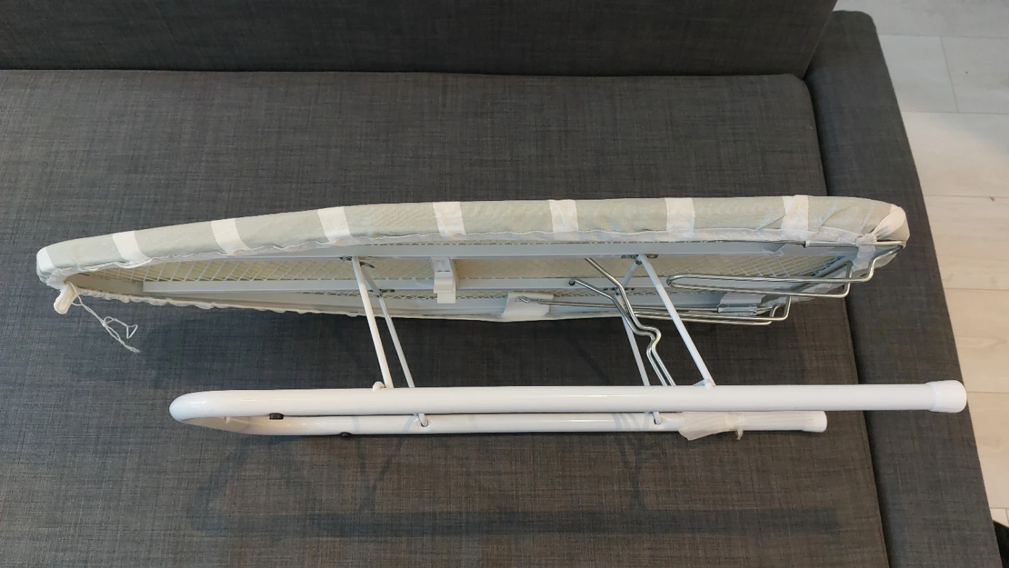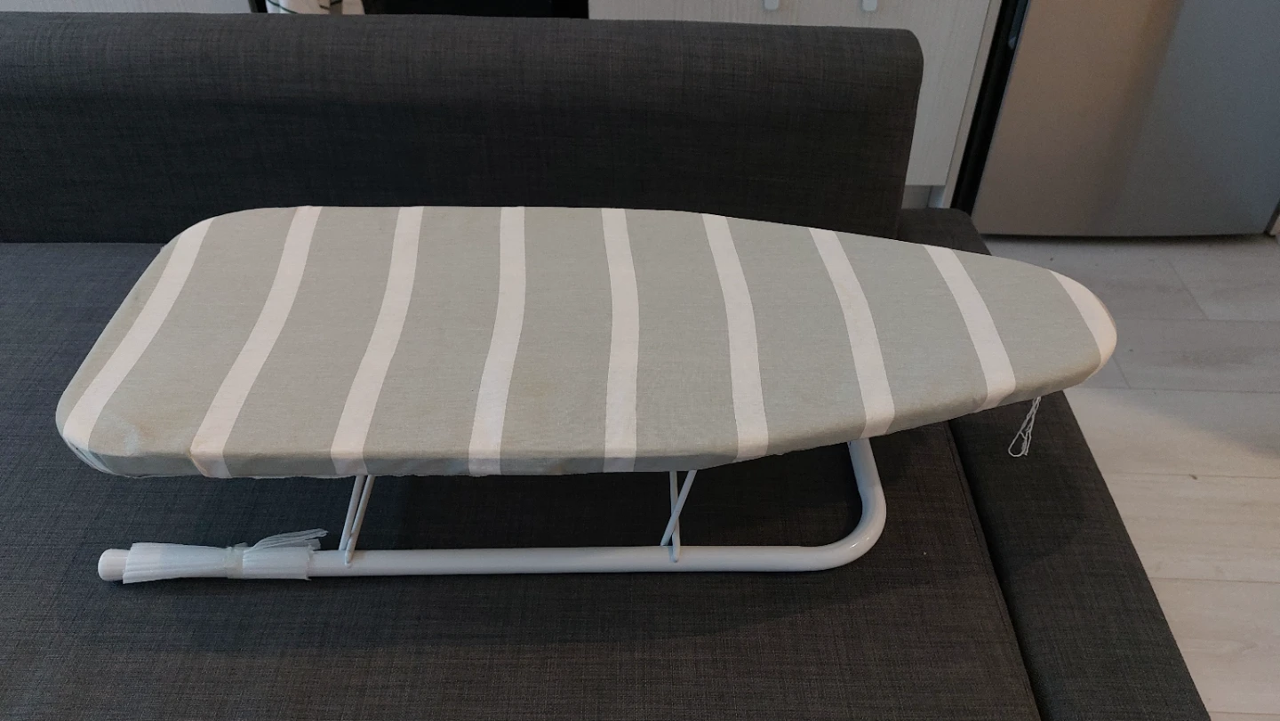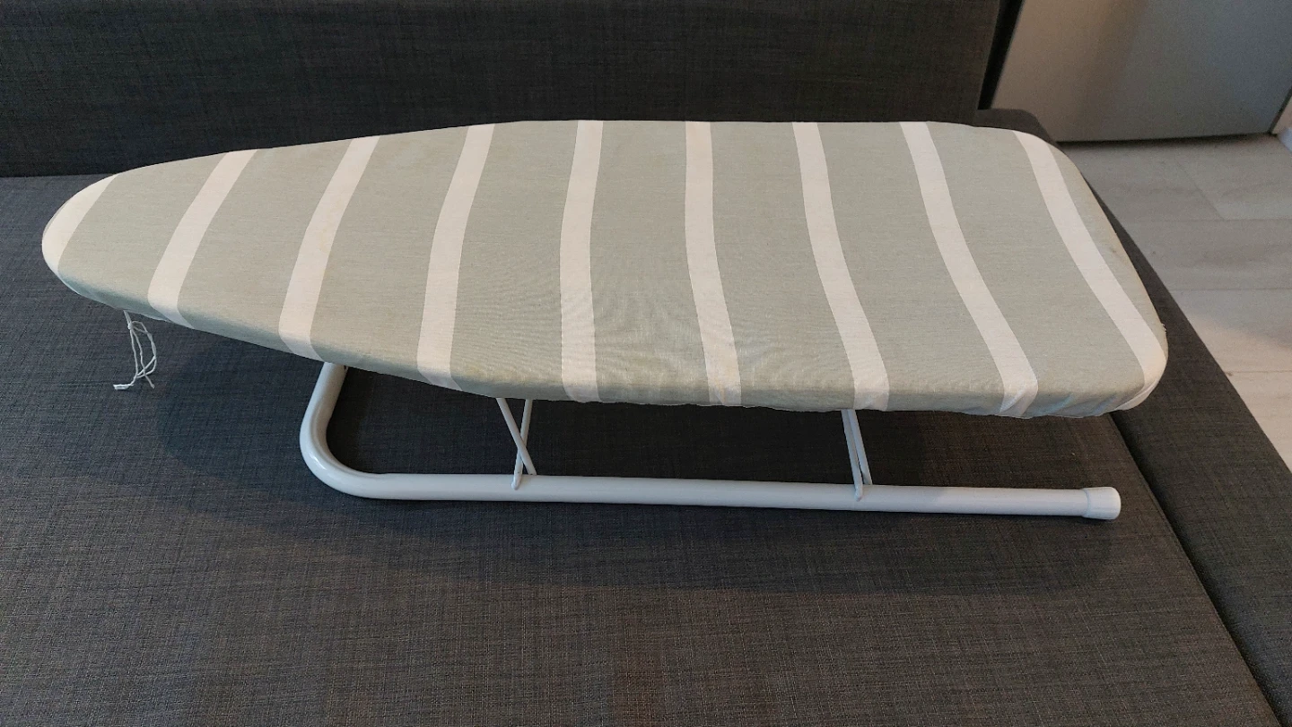 Compact ironing board with a striped cover. It's ideal for small spaces and quick touch-ups. The legs fold flat for easy storage.
