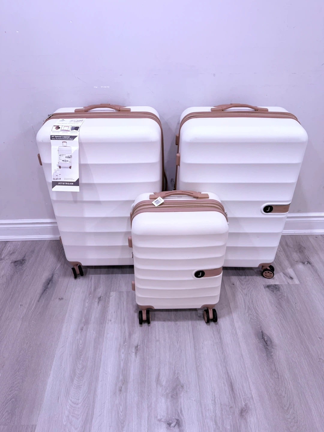 This set includes three Jetstream spinner suitcases in white with brown accents. It's great for family trips or extended travel. The hard-shell design offers durability for your belongings.