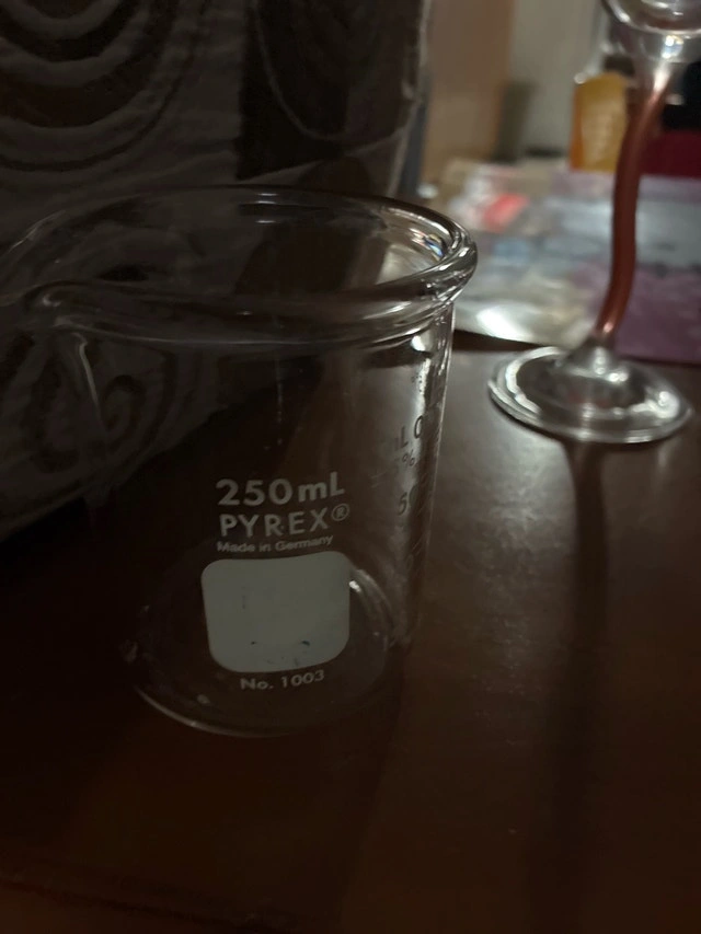This is a Pyrex 250mL beaker, perfect for any lab or science project. Perfect for chemistry.