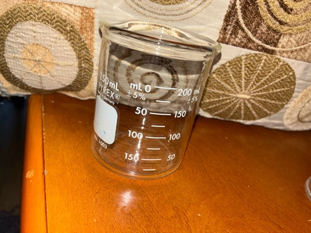 This is a Pyrex 250mL beaker, perfect for any lab or science project. Perfect for chemistry.
