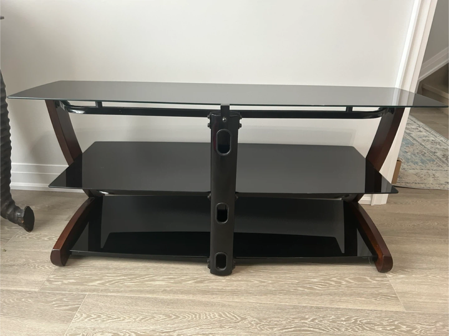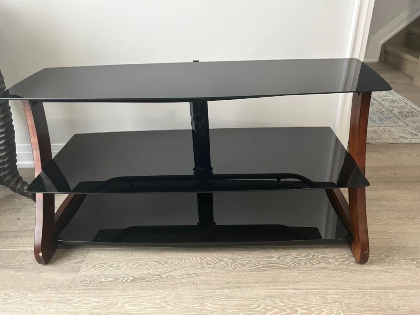 Selling a TV stand featuring a black glass top and a wooden frame. It has a two-tiered design for extra storage or display space. There are some visible scratches on the wooden part.