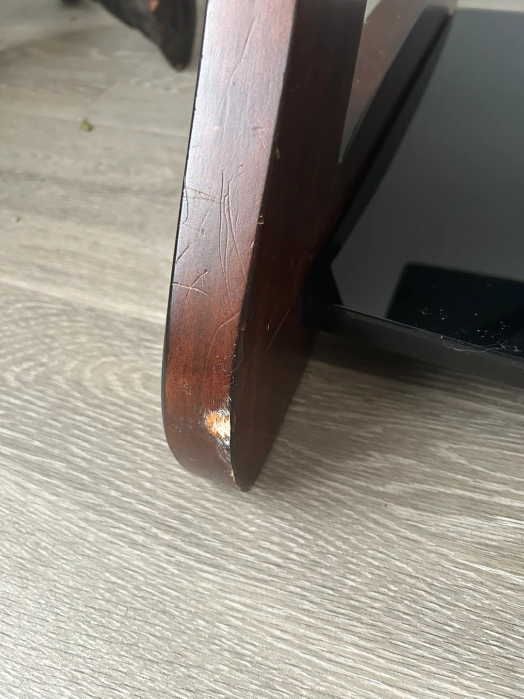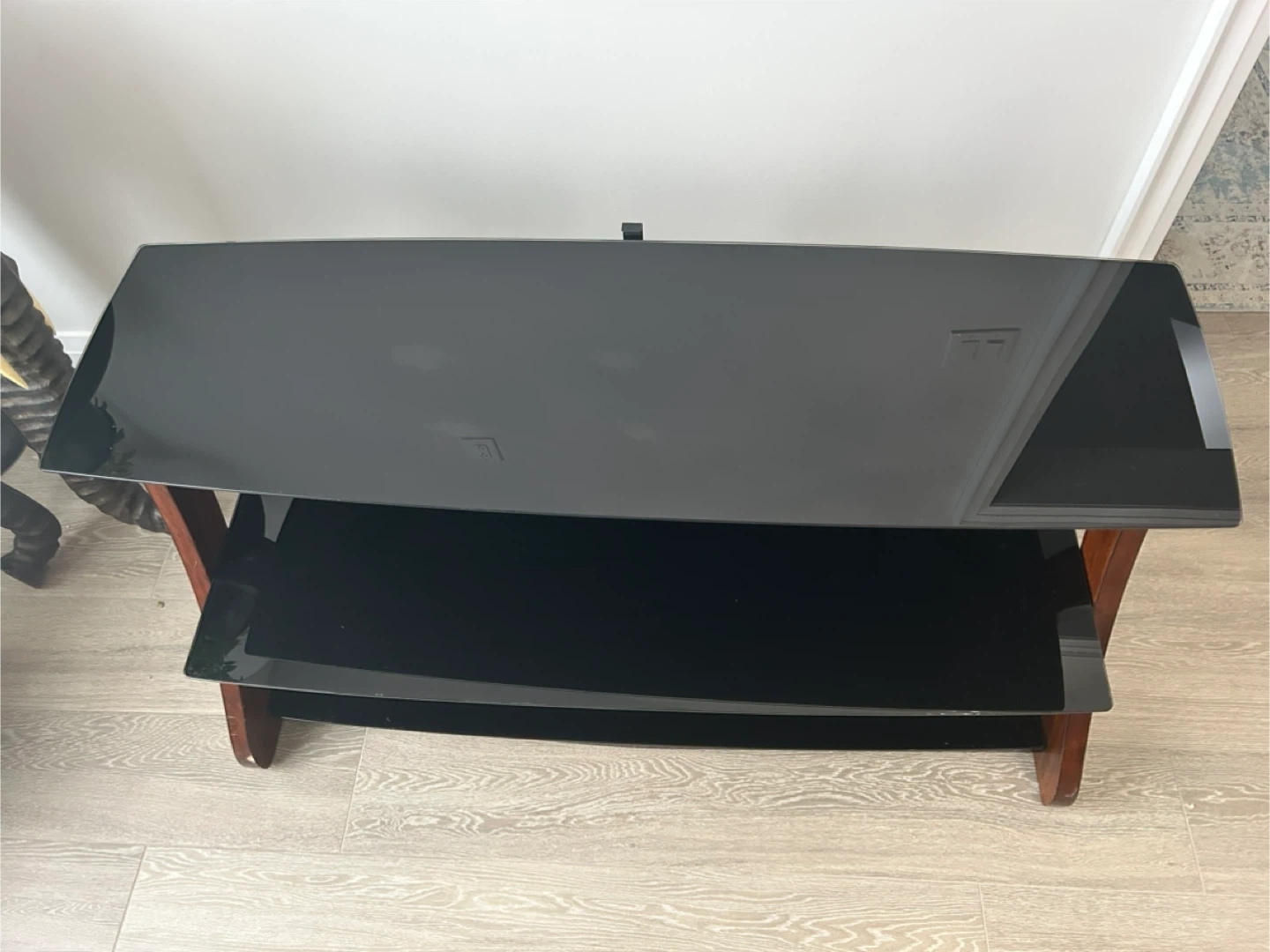 Selling a TV stand featuring a black glass top and a wooden frame. It has a two-tiered design for extra storage or display space. There are some visible scratches on the wooden part.