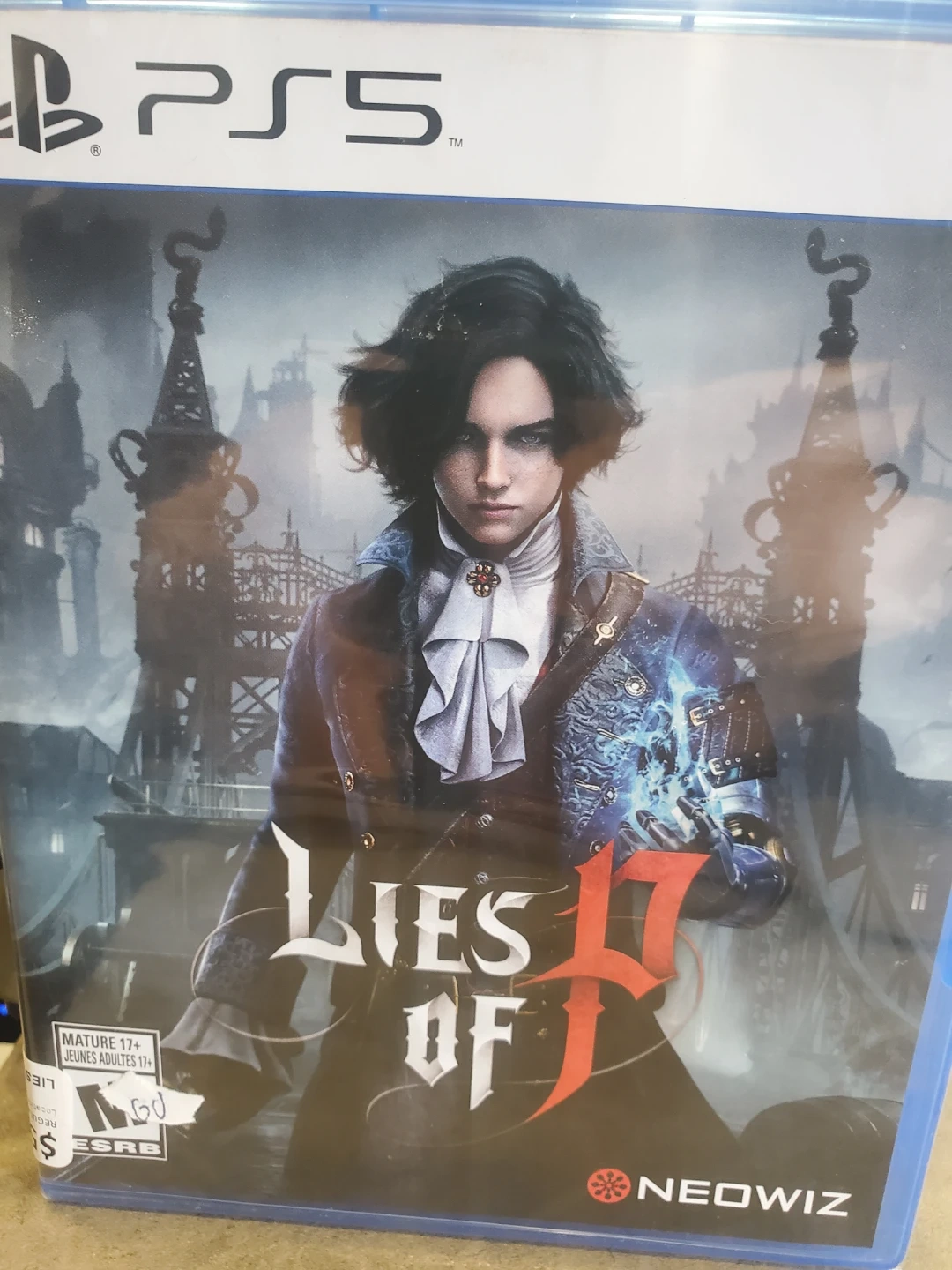 This is the Lies of P video game for PlayStation 5. It's an action game set in a dark Belle Époque city. The game involves combat with twisted weapons and unique lies.