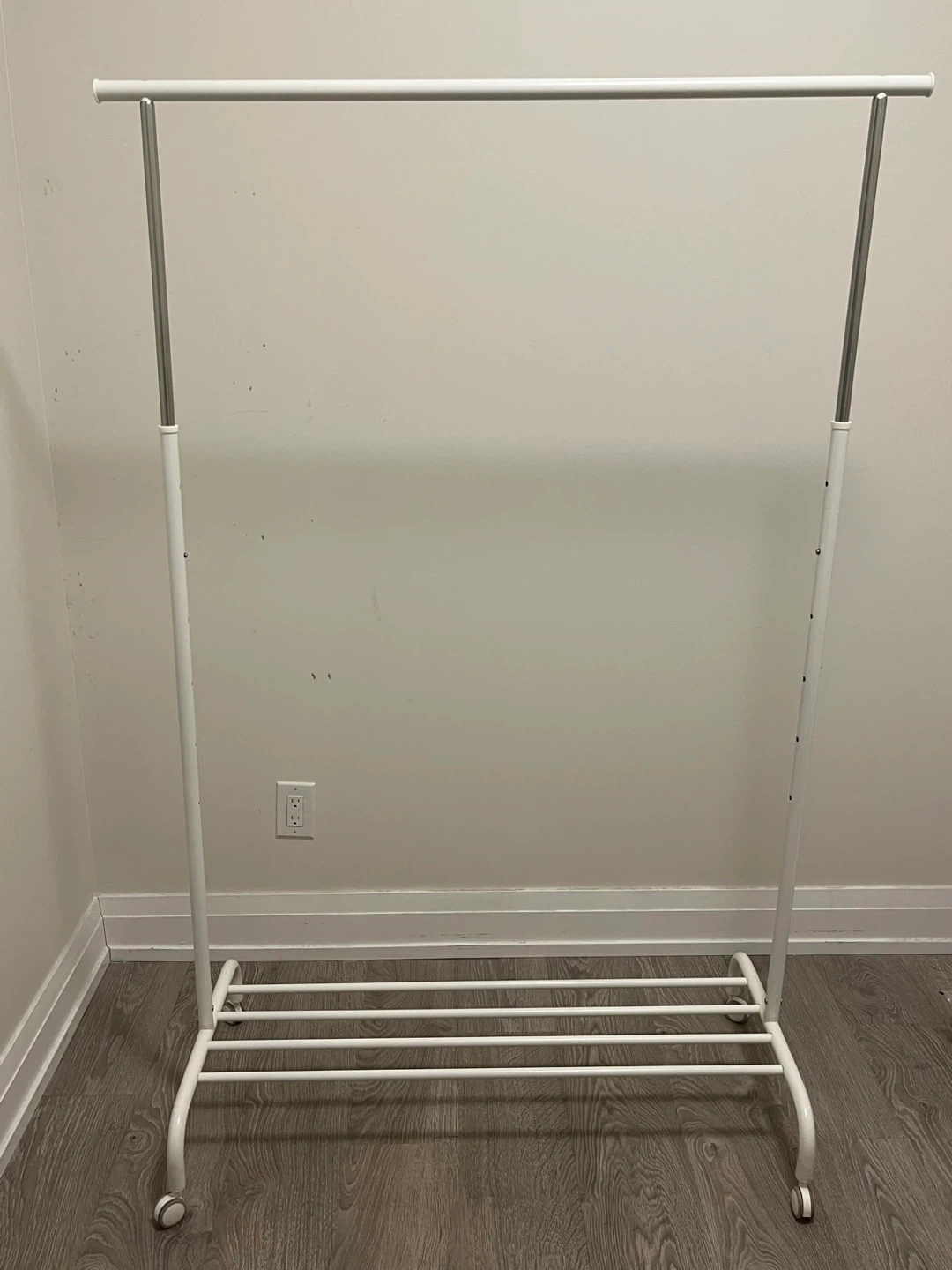 White Garment Rack with Wheels and Shelf