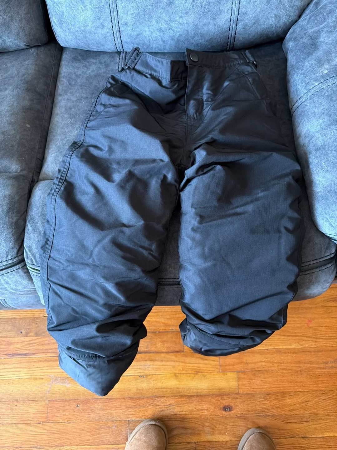 Black insulated ski pants. Durable shell for warmth and protection. Features adjustable waist tabs and sturdy zippers. Perfect for cold weather activities!