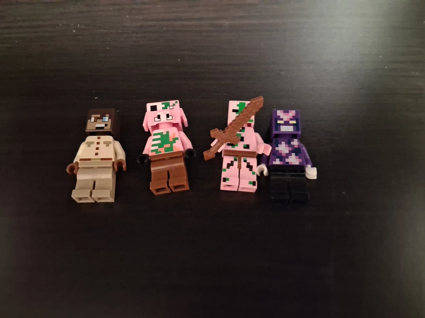 Four Minecraft mini figures included. Figures are made of plastic and have movable parts. Includes characters with pink and purple designs, and one with a sword accessory.