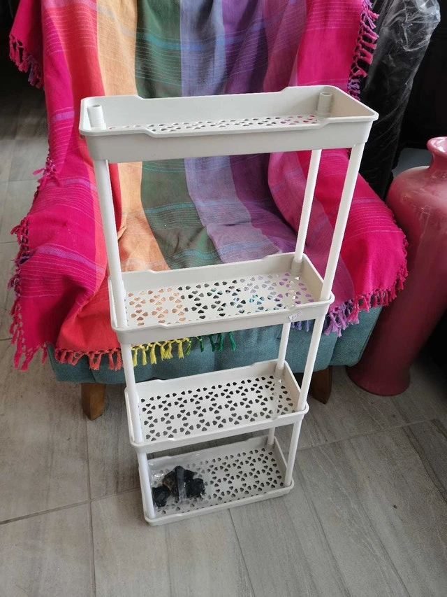 This white, three-tier shelf is perfect for adding extra storage to any room. It's in used condition, but still sturdy and functional. Great for organizing items in the bathroom, kitchen, or closet. 35x15x85cm If the ad is still up, the shelf is available.