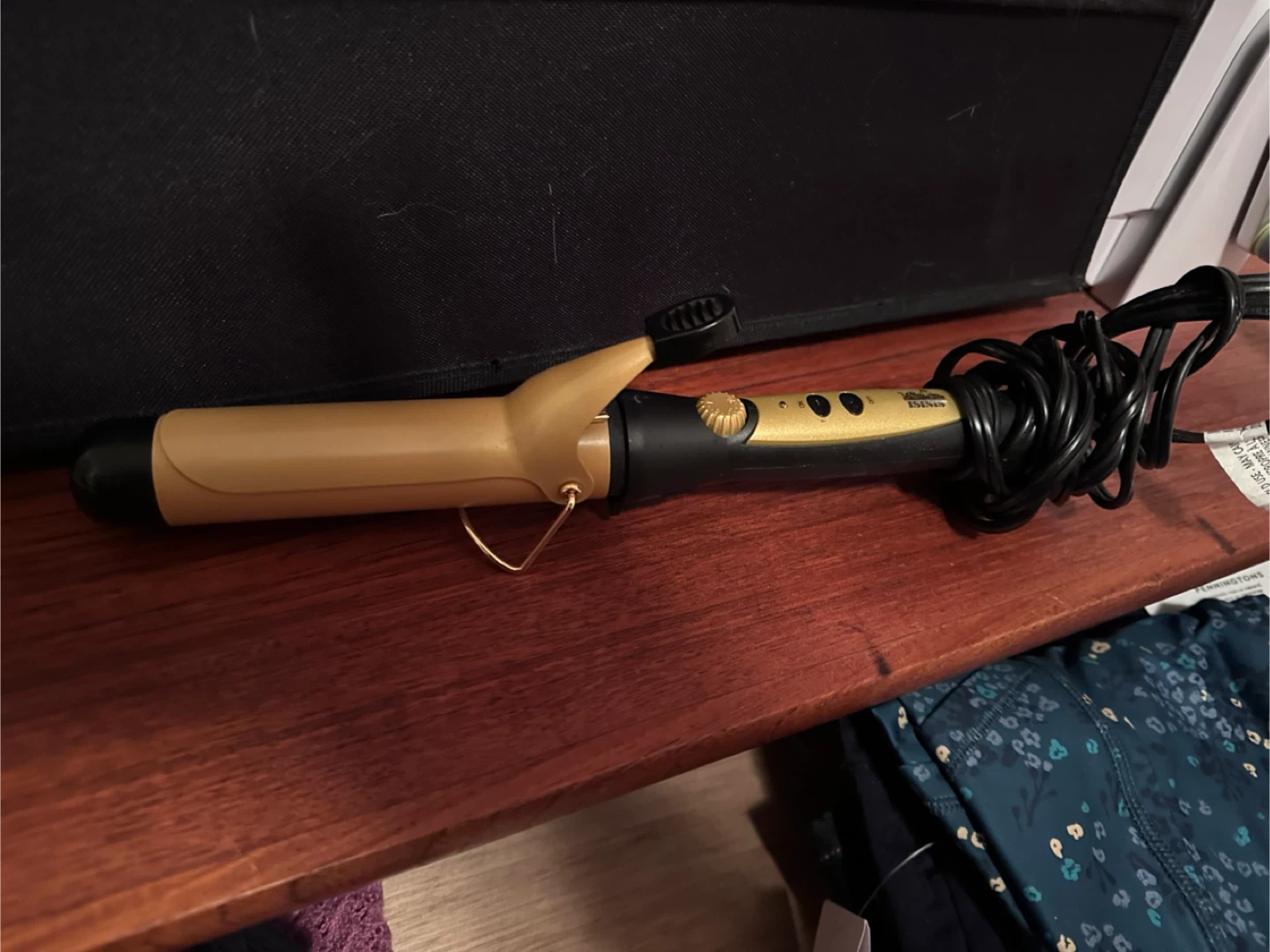 This ISINIS curling wand comes in a stylish gold and black colour. It's designed for creating curls and waves in your hair. The wand has an on/off switch and a temperature control dial.