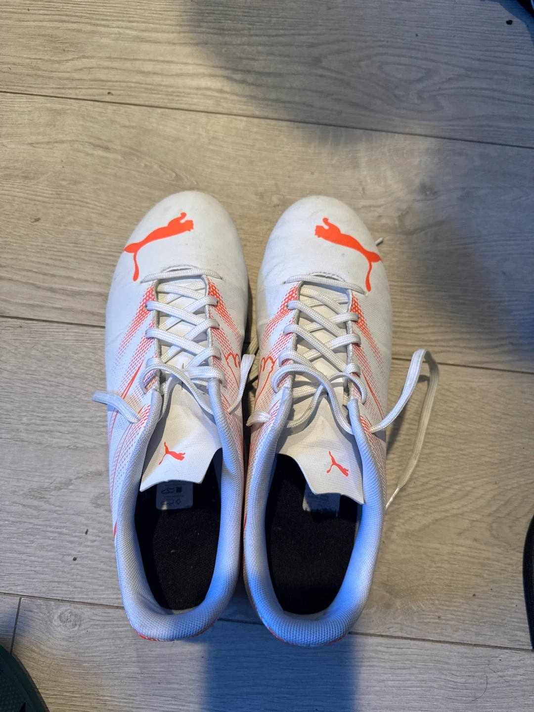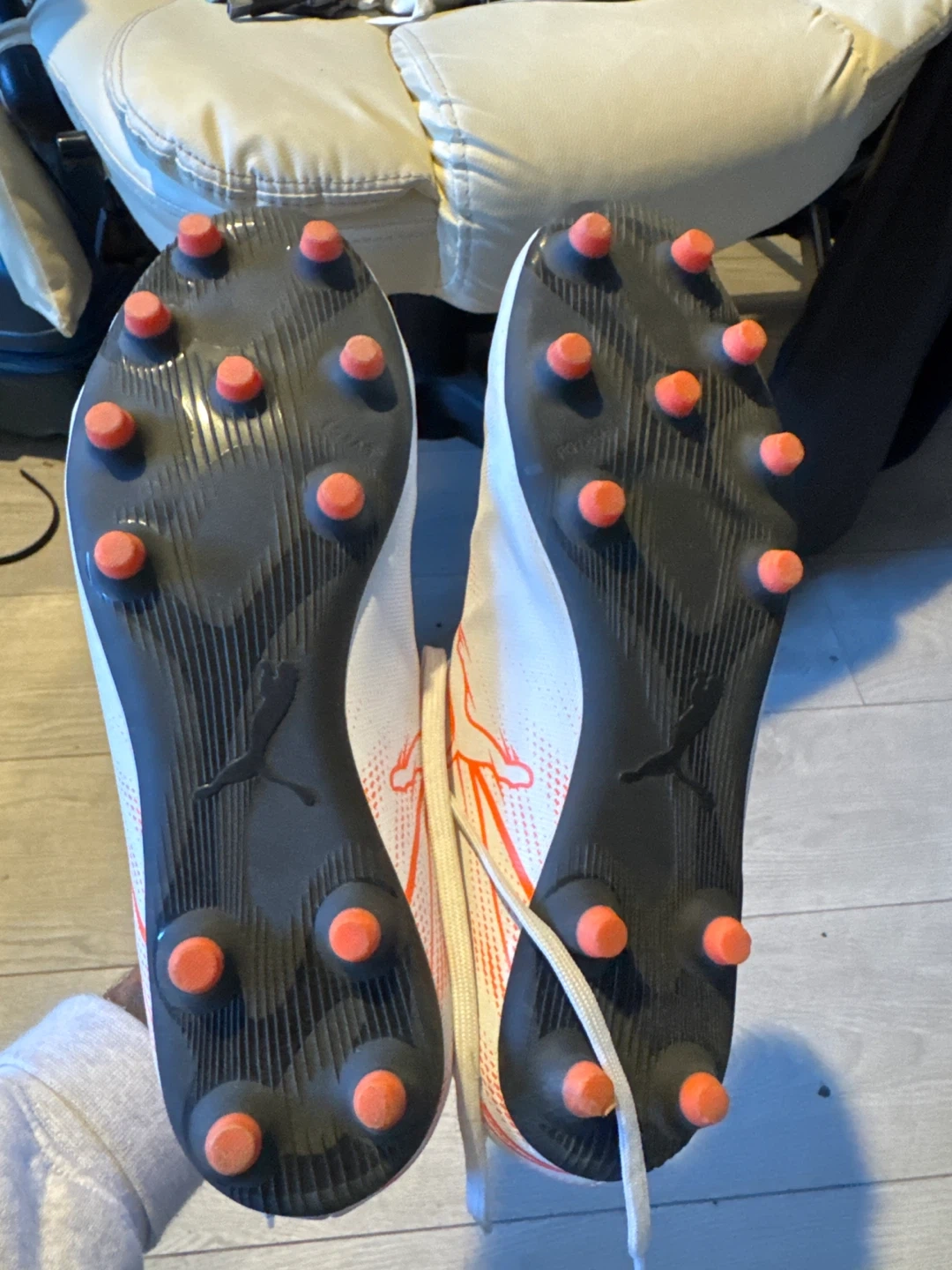 These are Puma soccer cleats in white with orange accents. They feature a synthetic upper and rubber stud sole for traction. Perfect for playing on turf or grass fields!