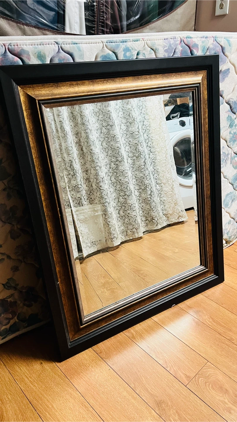 A decorative wall mirror with a black and gold ornate frame. It's perfect for adding a touch of elegance to any room. Its dimensions are approximately 20x24 inches.