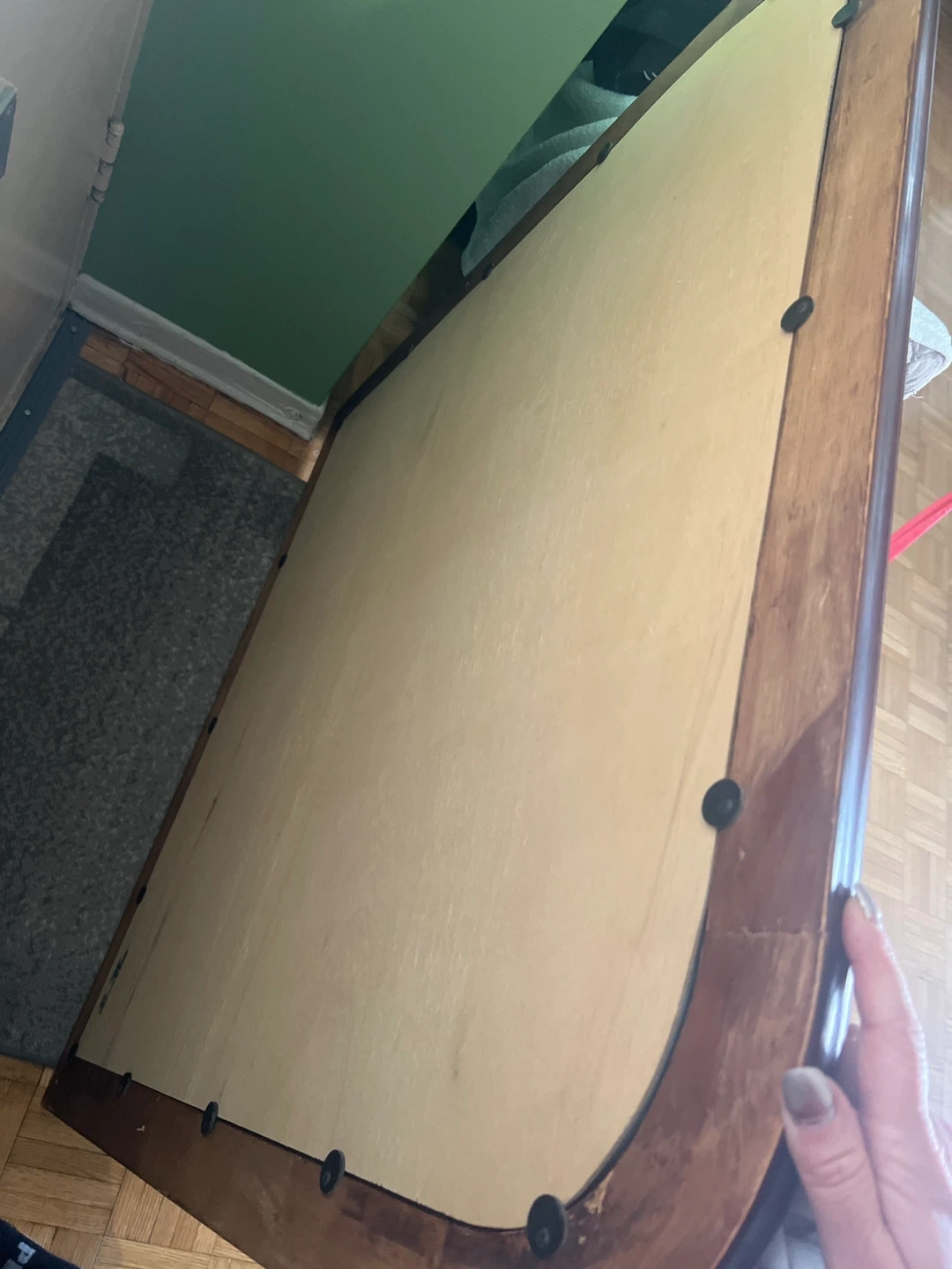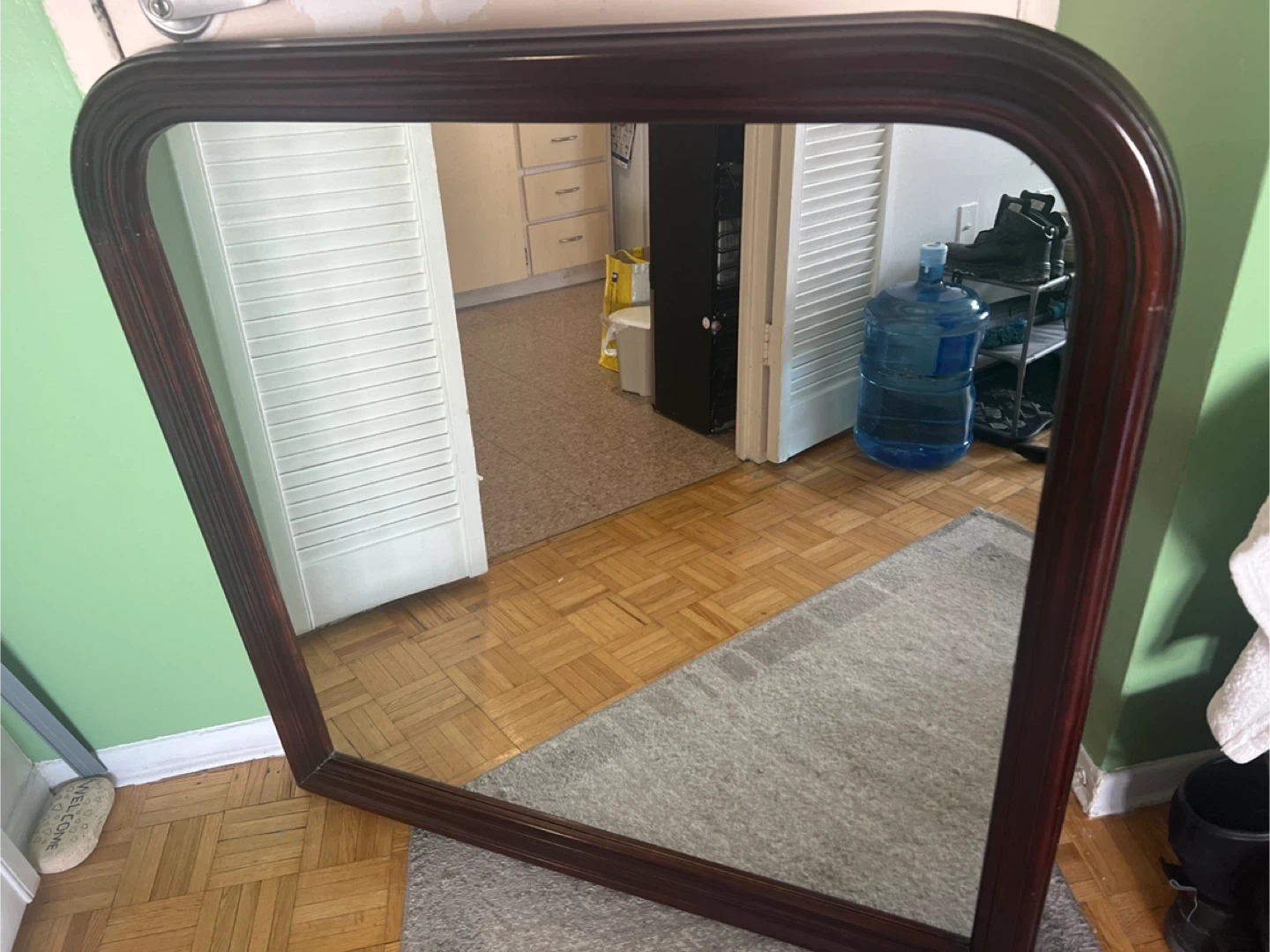 This is a decorative mirror with a dark wooden frame. It's a nice size for an entryway or bedroom. The frame has a curved top edge.