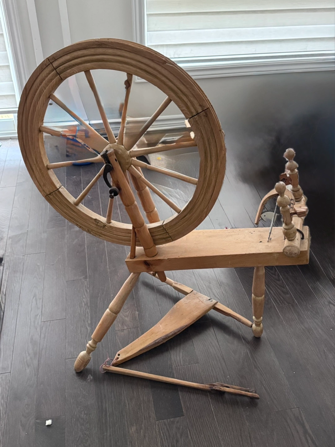 Vintage spinning wheel. Wooden construction. Shows signs of age and wear. Large wheel. Ornate details. Some repairs required