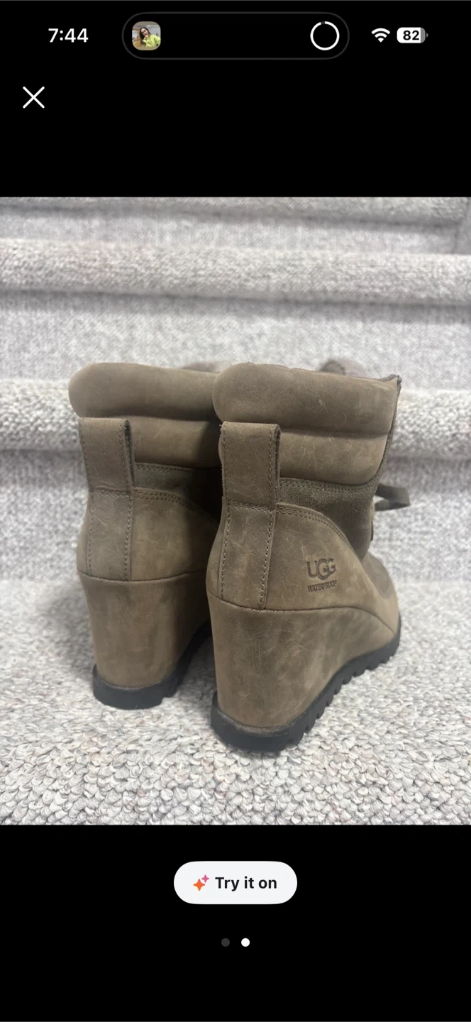 These UGG boots are waterproof and feature a stylish wedge heel. They're made with a combination of suede and leather for durability. The fur lining provides extra warmth. Perfect for cold and wet weather! Pick up cash only