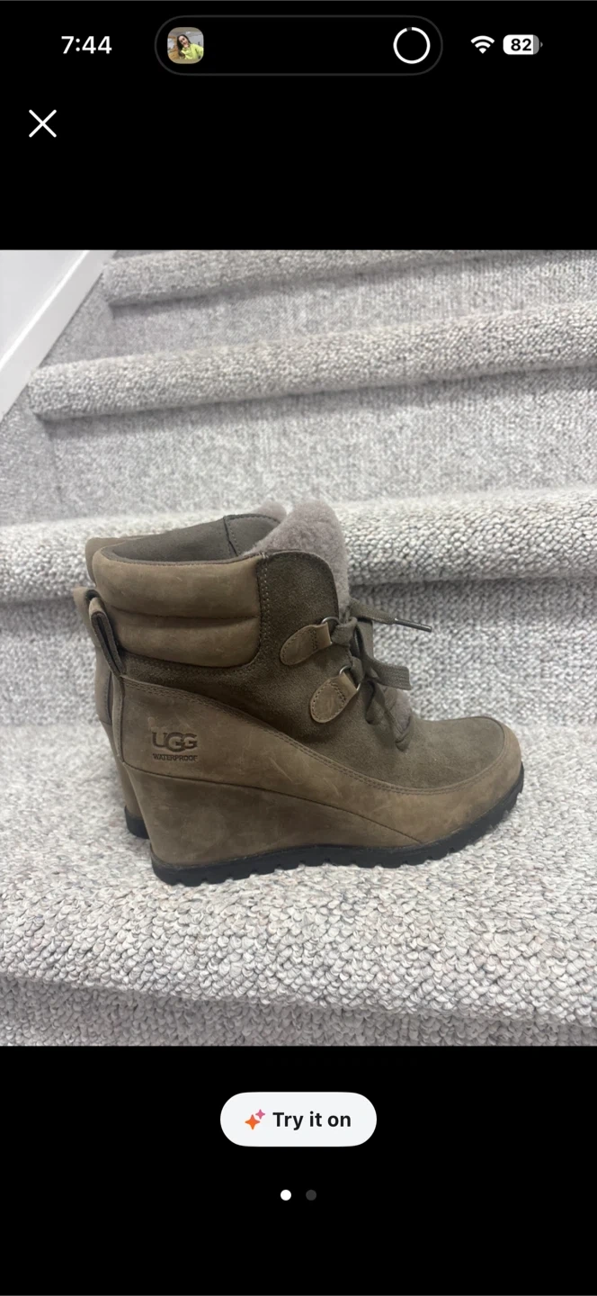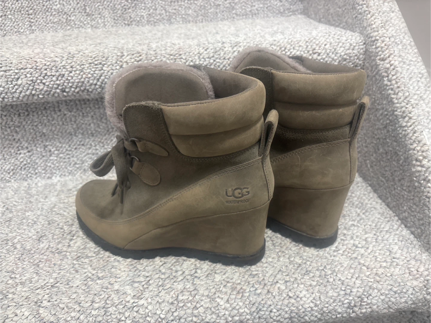 These UGG boots are waterproof and feature a stylish wedge heel. They're made with a combination of suede and leather for durability. The fur lining provides extra warmth. Perfect for cold and wet weather! Pick up cash only