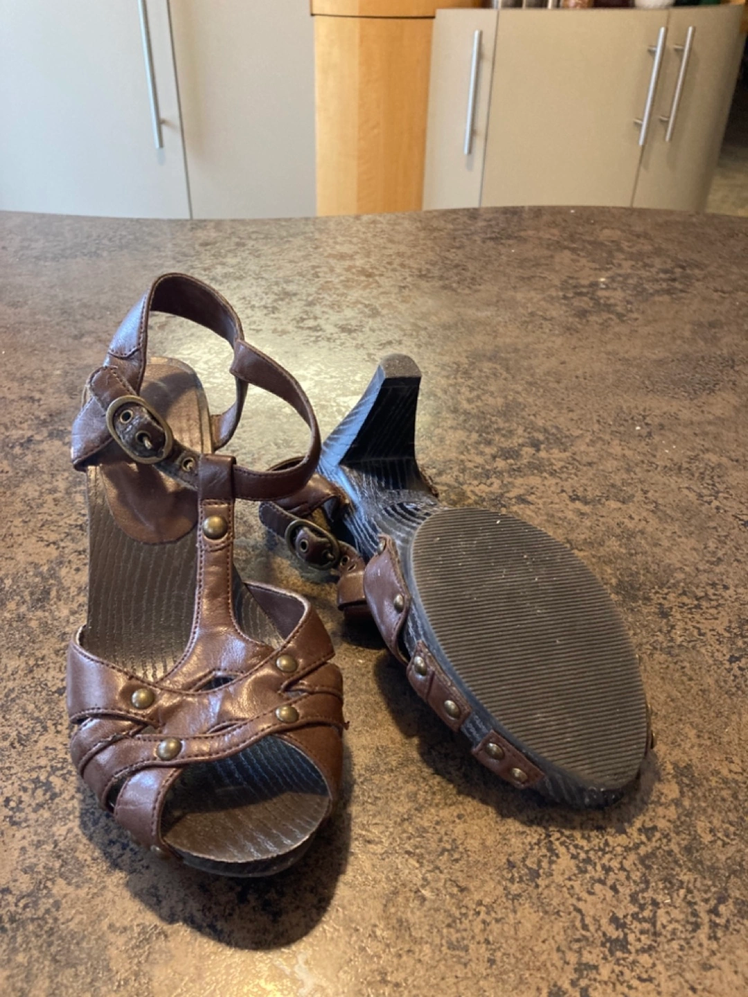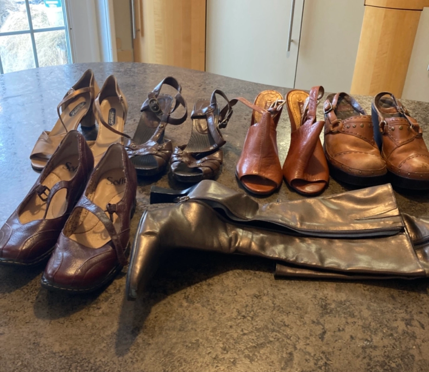 Women shoes, sandals, boots, dressy style. Beige, brown leather. Some wedges and heels. Sizes 5-6.5 Almost new. Prices $10-25 pp.