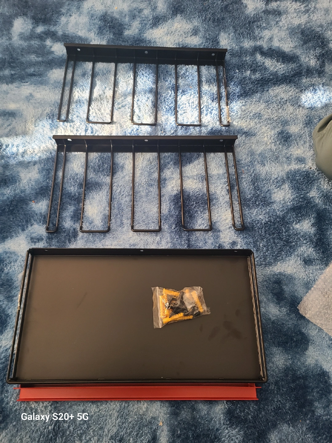Selling an under cabinet spice rack organizer in black! The organizer is in brand new condition and comes with the mounting hardware. It measures approximately 17 inches in length and 10 inches in width.