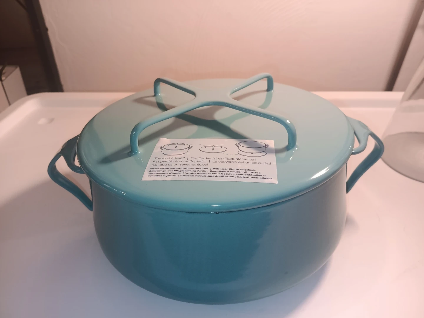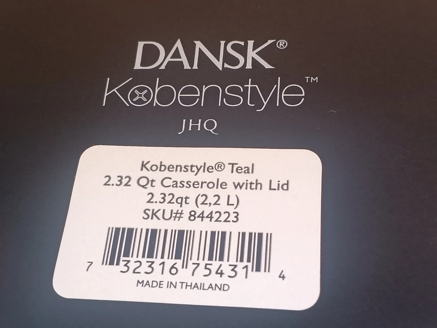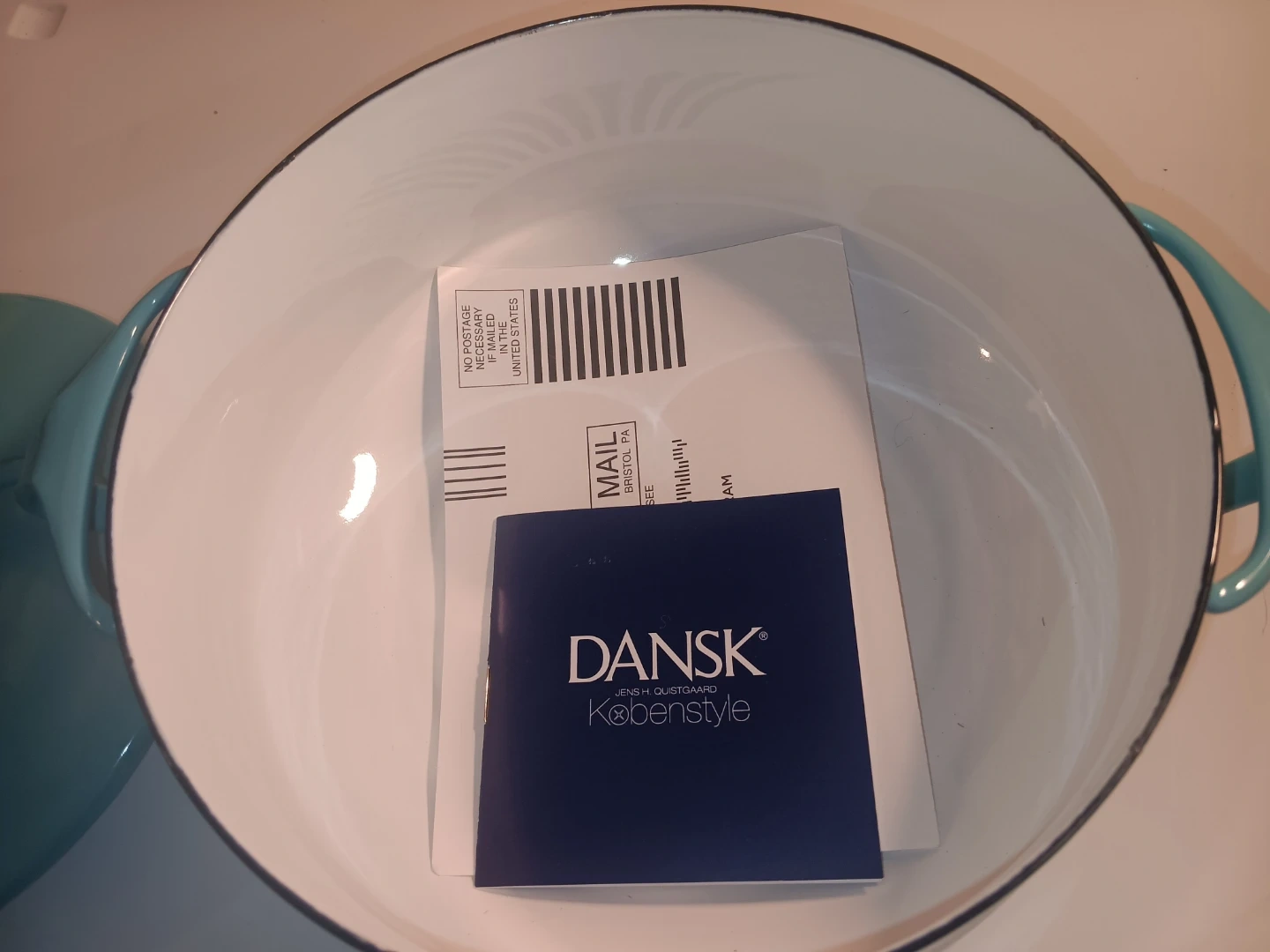 Dansk Kobenstyle 2.32 qt casserole pot with lid. Enamel coated cast iron. Teal blue exterior with white interior. Pot measures approximately 7 inches tall with lid on.