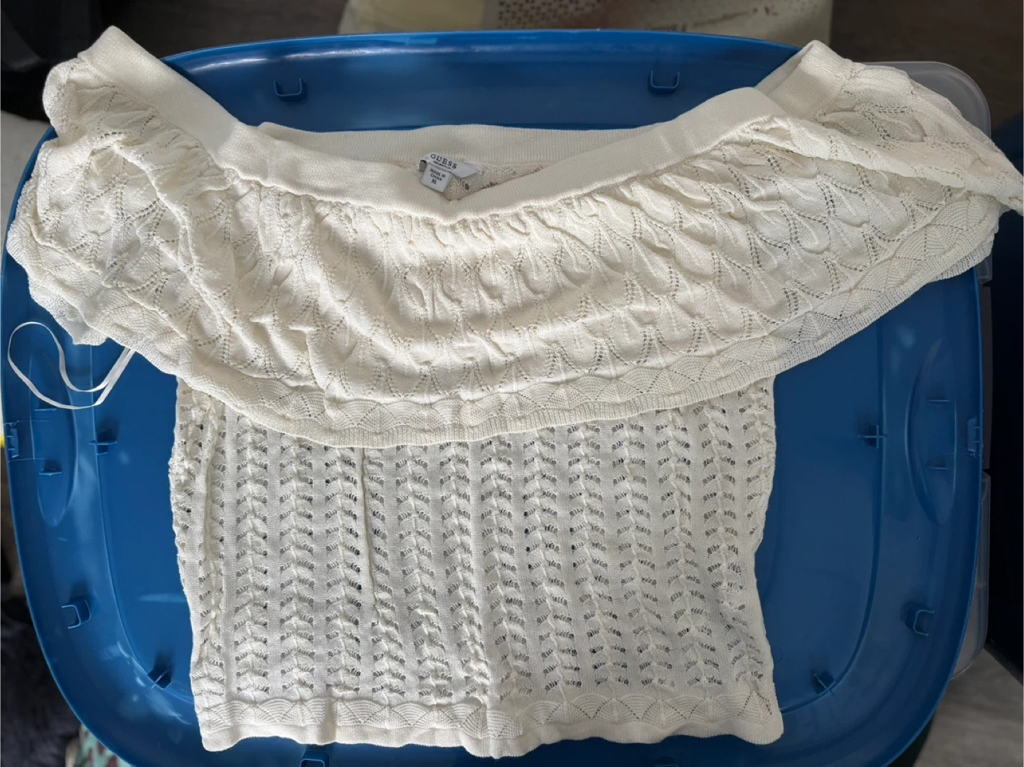 This is a cream-coloured Guess off-the-shoulder knit sweater. It features a ruffled neckline and a textured stitch pattern.
