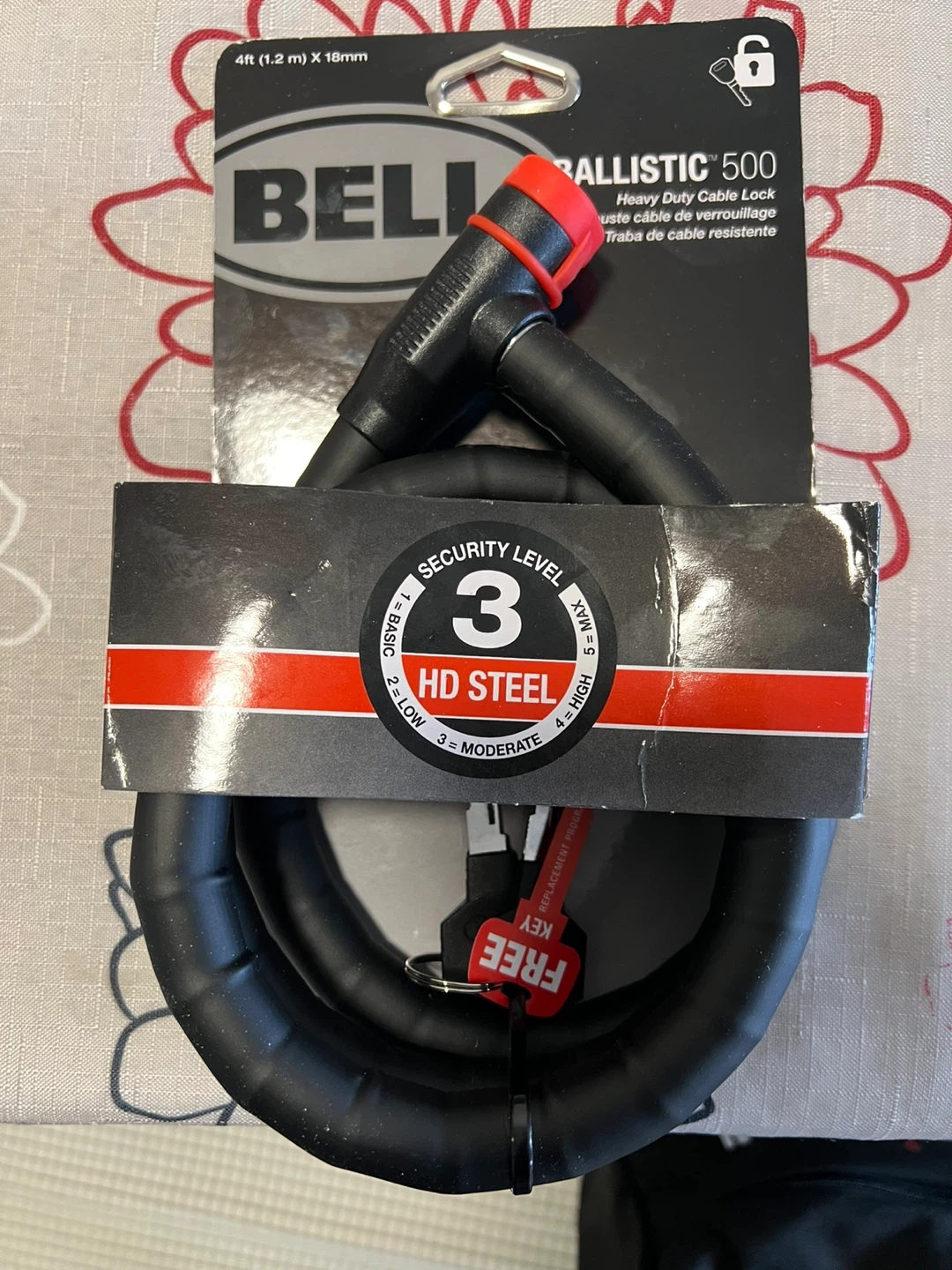 This is a Bell Ballistic 500 heavy-duty cable lock. It's 4ft (1.2 m) long and 18mm thick. The cable is made of HD Steel and has a security level of 3.