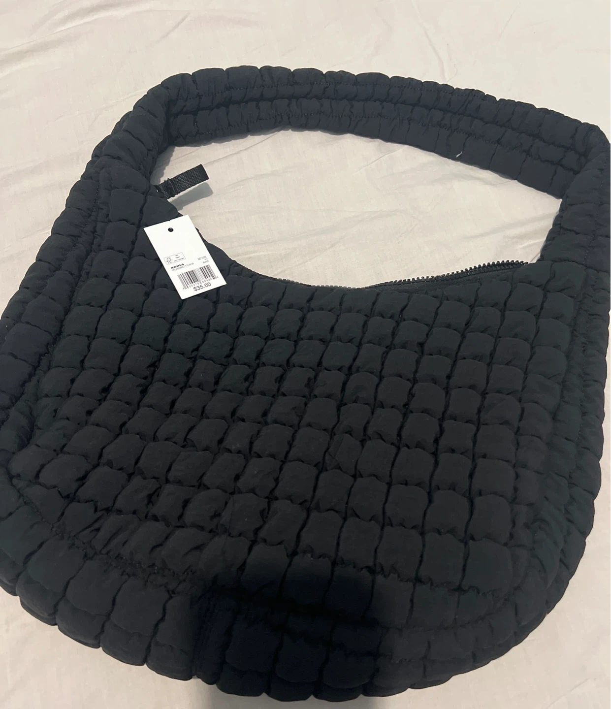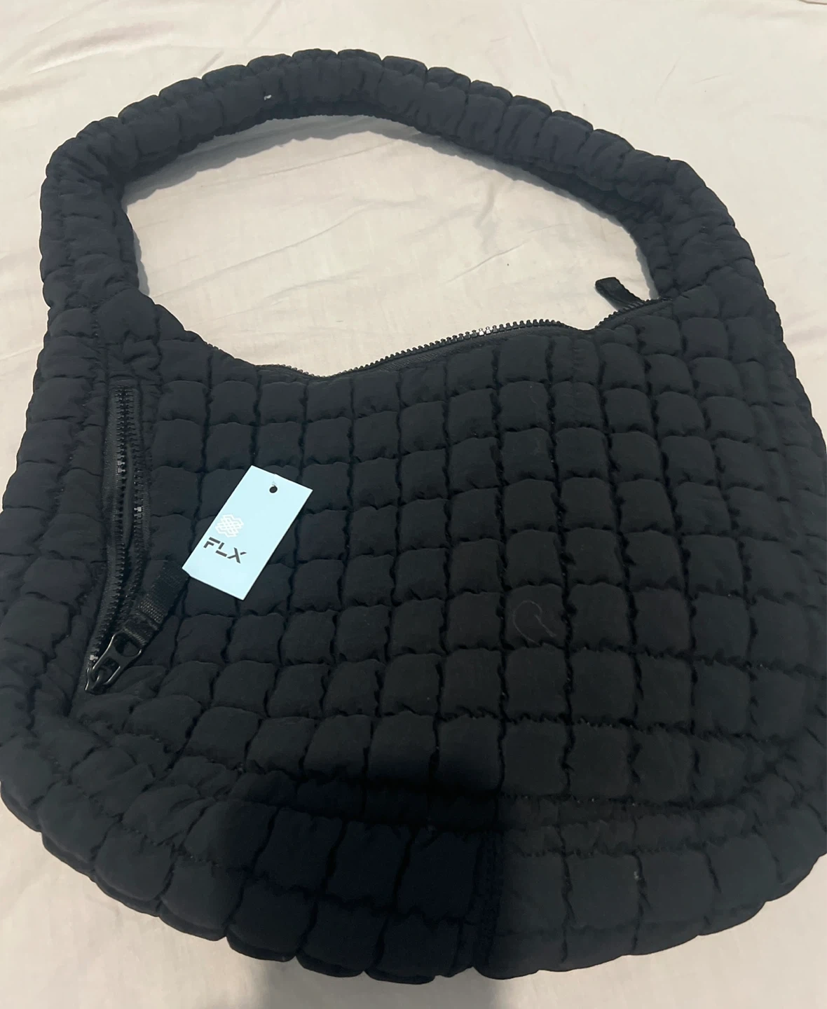 Black quilted hobo bag from FLX. It's made of nylon with a zippered closure and an exterior zip pocket. Spacious interior with satin lining.