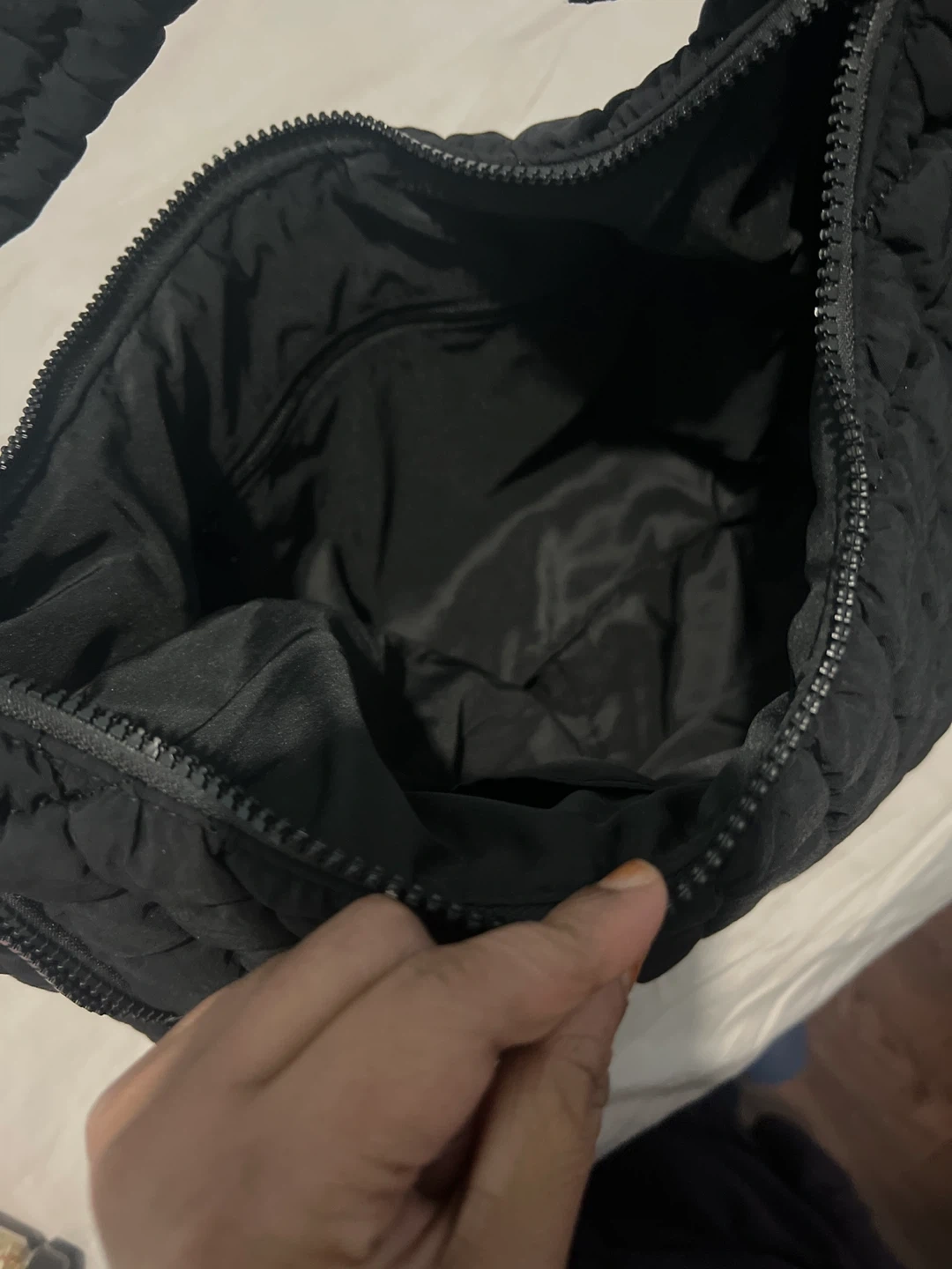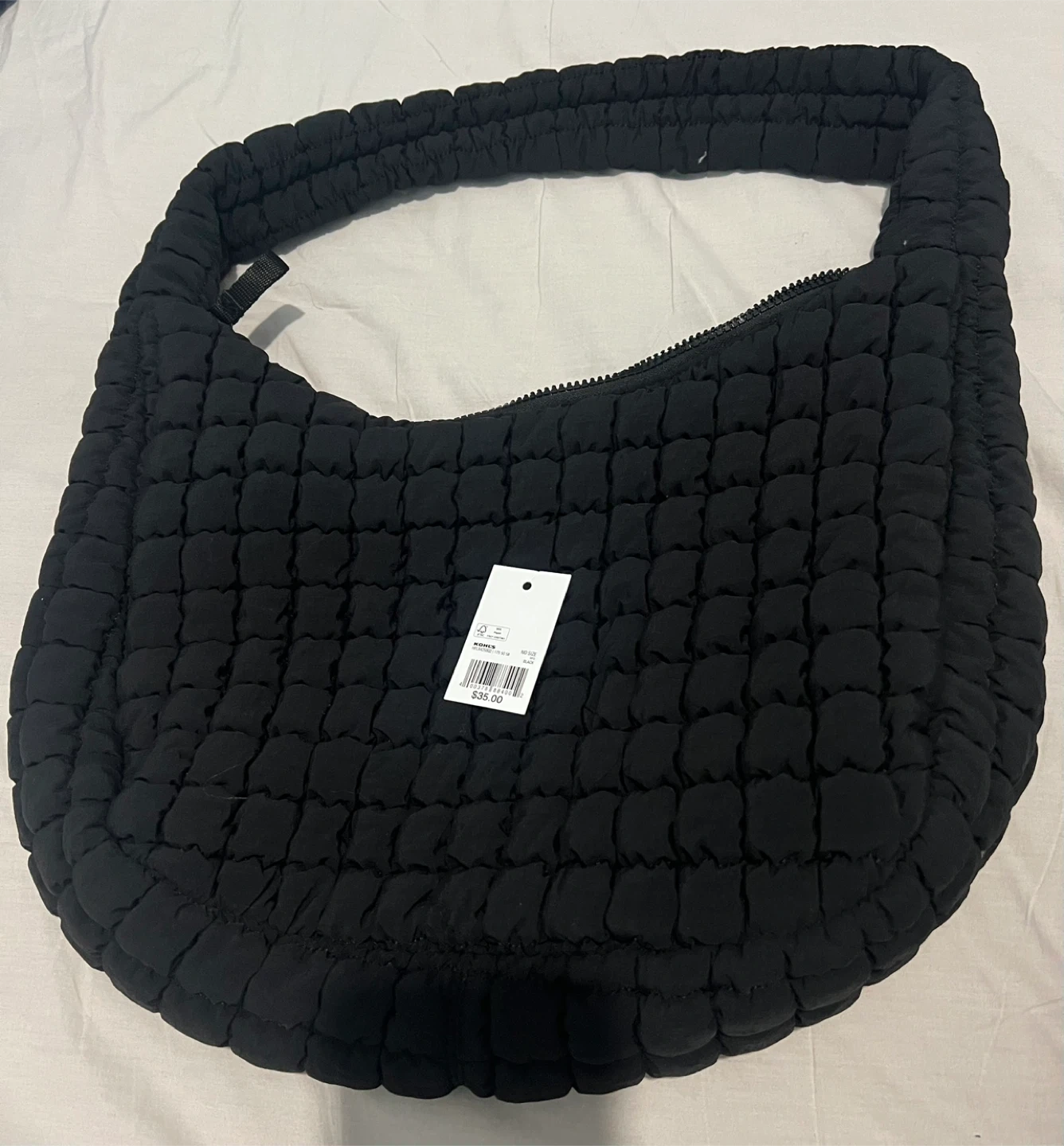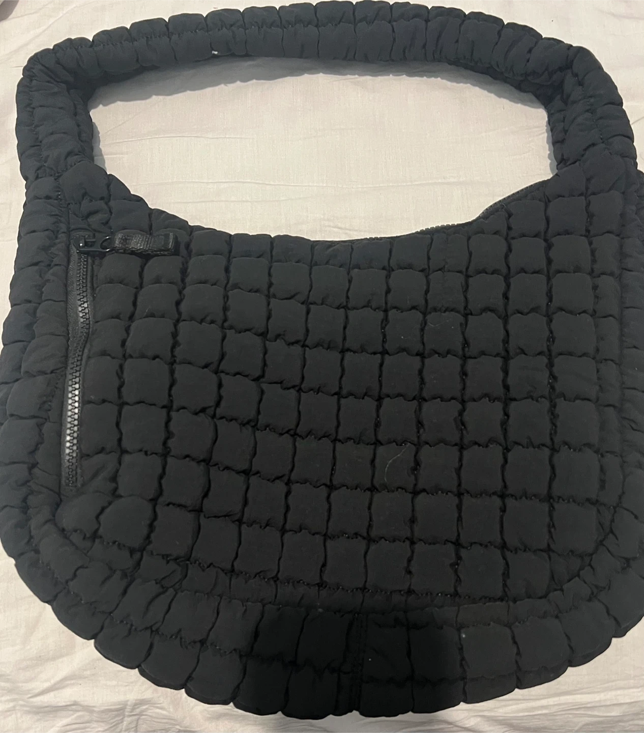 Black quilted hobo bag from FLX. It's made of nylon with a zippered closure and an exterior zip pocket. Spacious interior with satin lining.