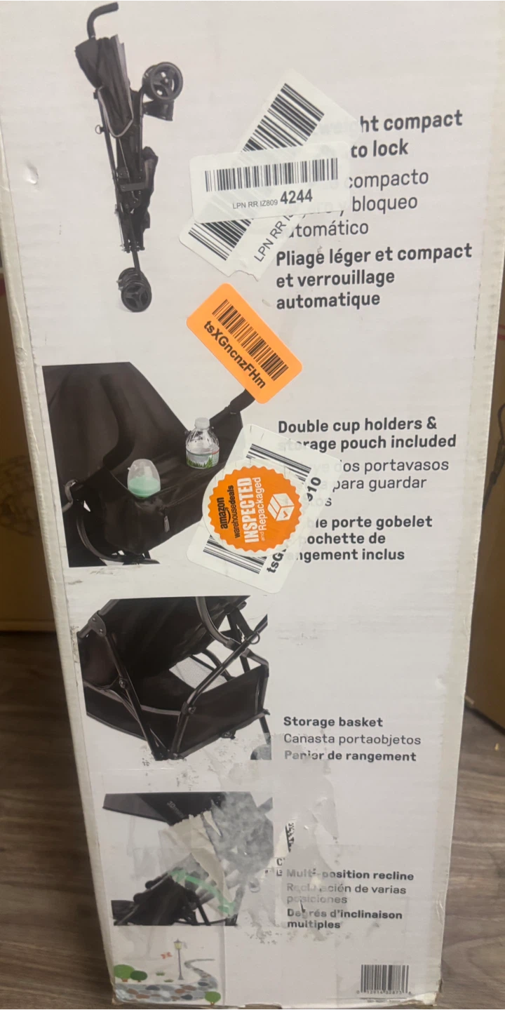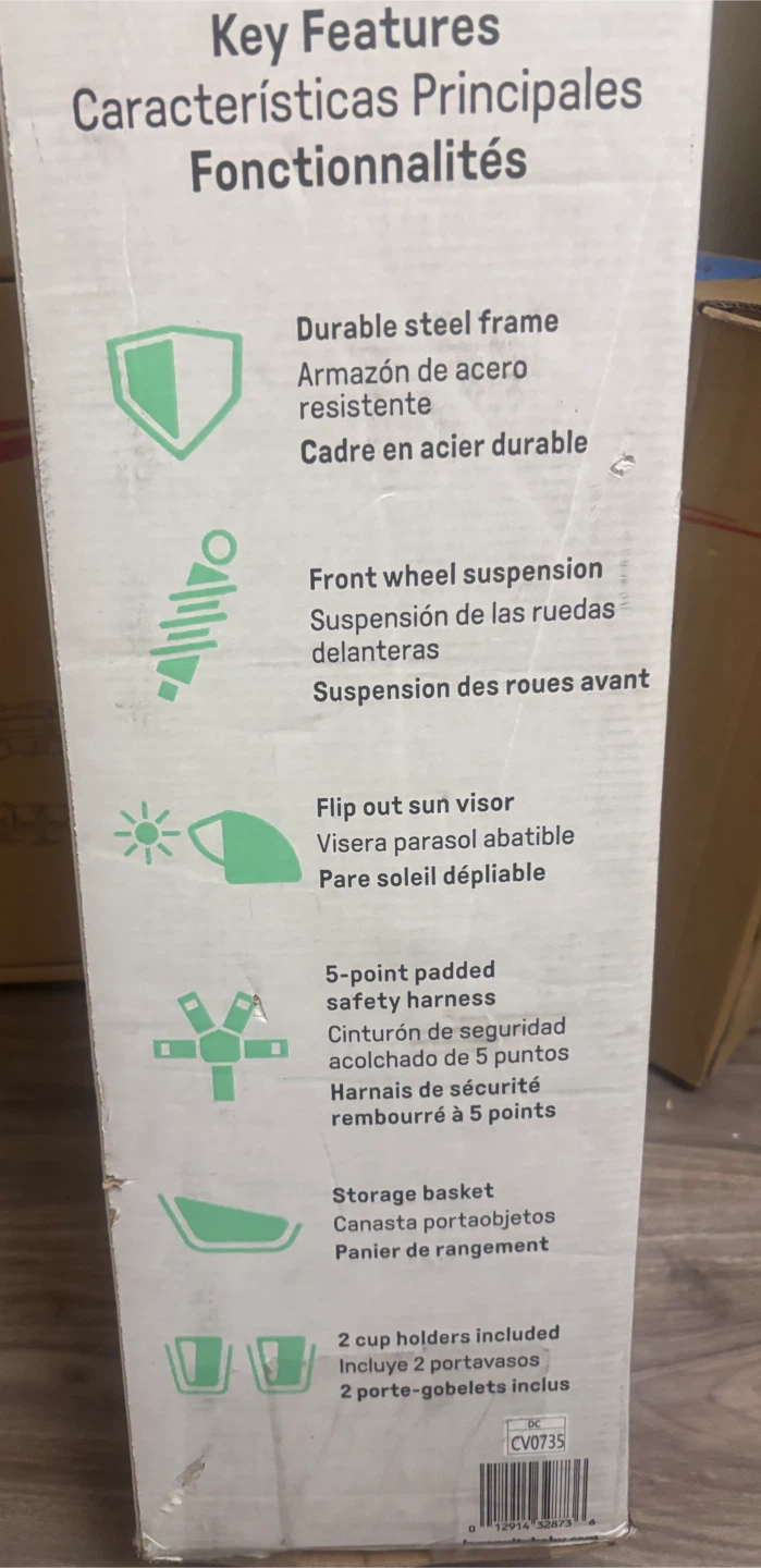 Features include a durable steel frame, front wheel suspension, a flip-out sun visor, a 5-point padded safety harness, a storage basket, and 2 cup holders. It also has a compact fold with auto-lock