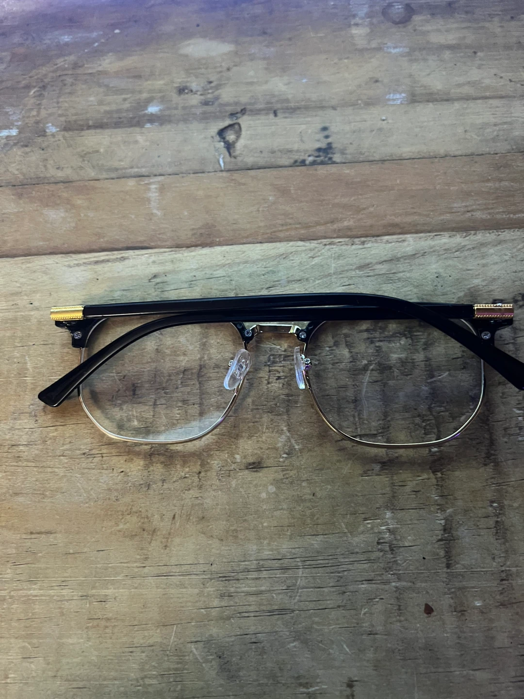 These clubmaster-style glasses have a black acetate top bar and gold metal rims. They feature clear lenses and adjustable nose pads. These frames are suitable for blue light lenses.