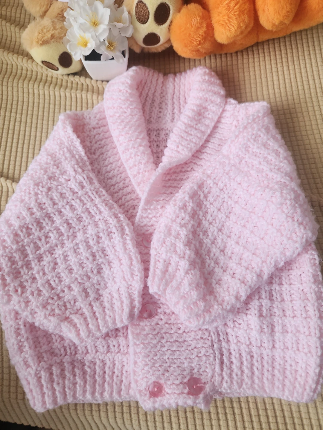 Sweet pink hand-knit cardigan with two button closures. It's soft and cozy for little ones! The material is wool that keeps your baby warm.