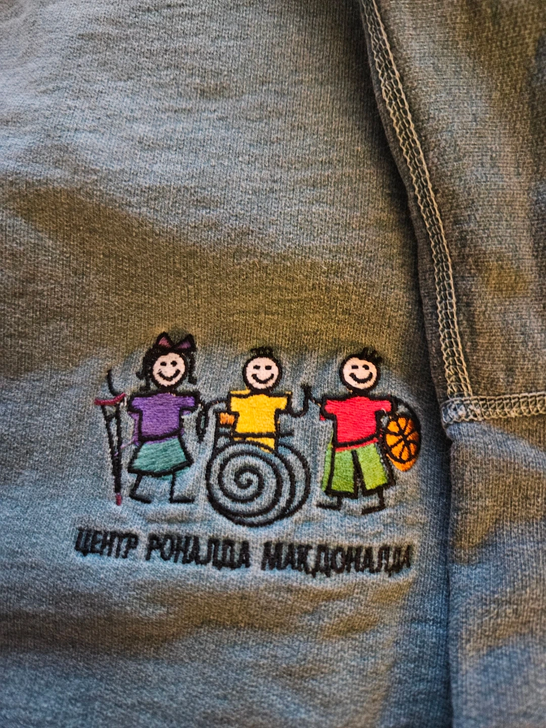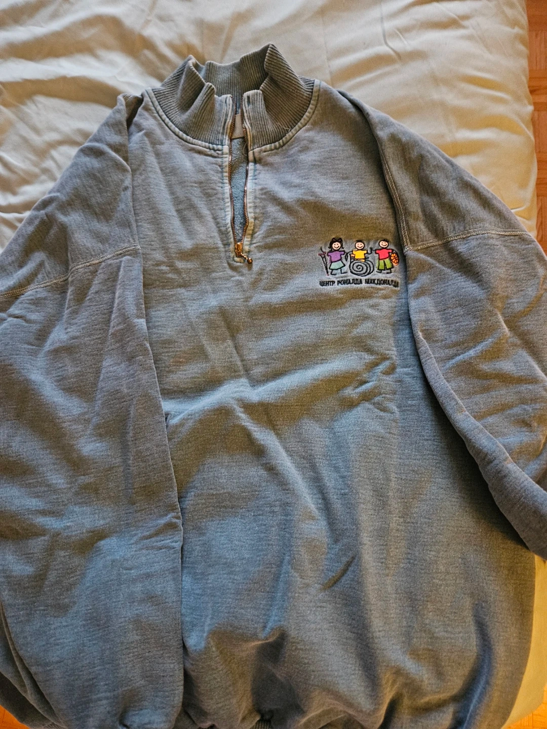 Russian McDonald's 1/4 zip sweatshirt in grey, size XL. Features embroidered logo for Centre of Ronald McDonald. Made in Canada from cotton/coton blend.