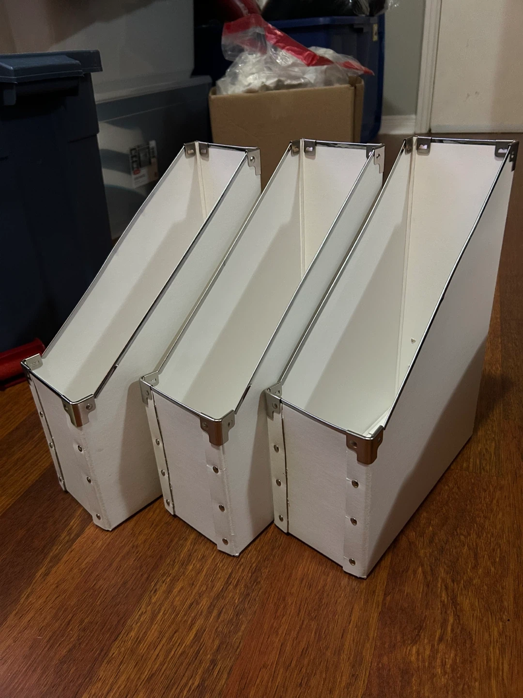 Get organized with this set of three white magazine holders. They're perfect for tidying up your desk or shelves. Each holder features a sturdy construction with metal corner reinforcements for durability.